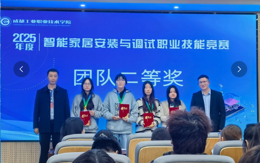 11月7日,2025年度智能家居安装与调试技能竞赛(高职组)在成都工业职业技术学院举办。我院建筑工程系装饰工程技术专业2023级8名学子组成的两支参赛队,在企业导师熊含与校内教师蔡静、叶青、徐倩等联合指导下,凭借“装饰专业+智能技术” 的跨界硬实力、...