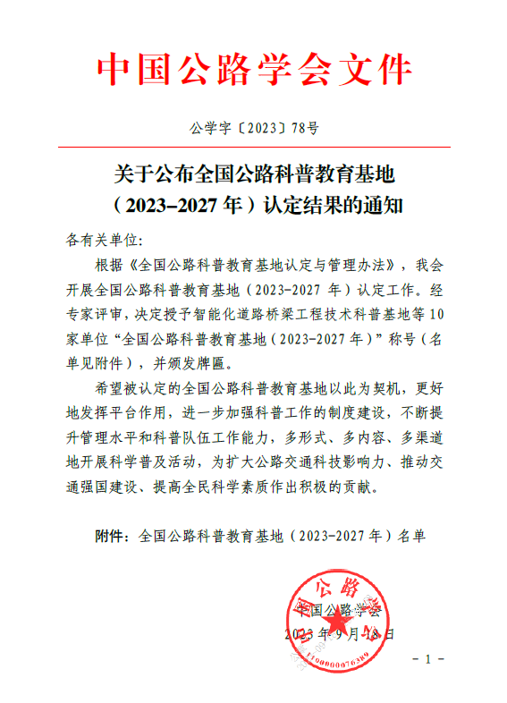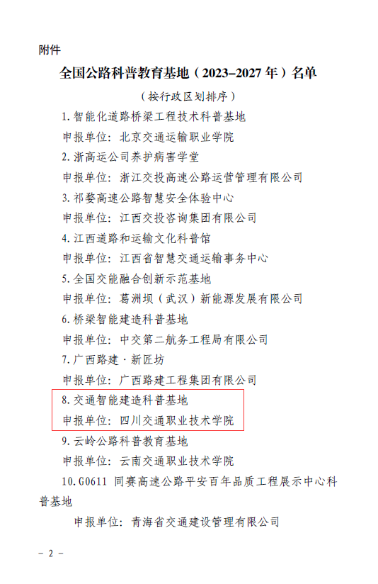 近日,中国公路学会公布了“全国公路科普教育基地(2023-2027年)”名单,川交职院道路与桥梁工程系申报的“交通智能建造科普基地”成功获批全国公路科普教育基地。中国公路学会于9月21日,在山西太原举行了隆重的授牌仪式。