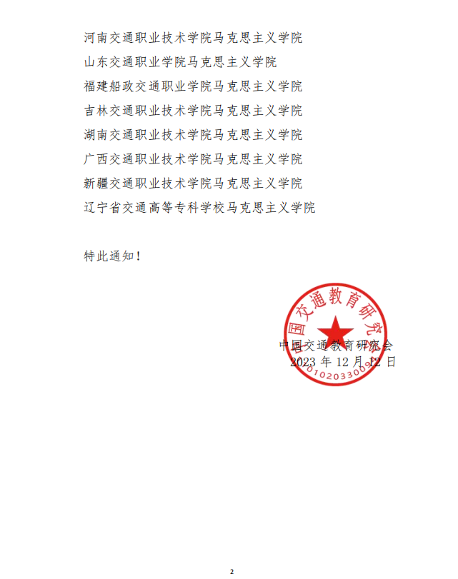 12月12日,中国交通教育研究会下发文件,公布了2023年全国交通职业院校示范马克思主义学院名单,四川交通职业技术学院马克思主义学院成功入选。