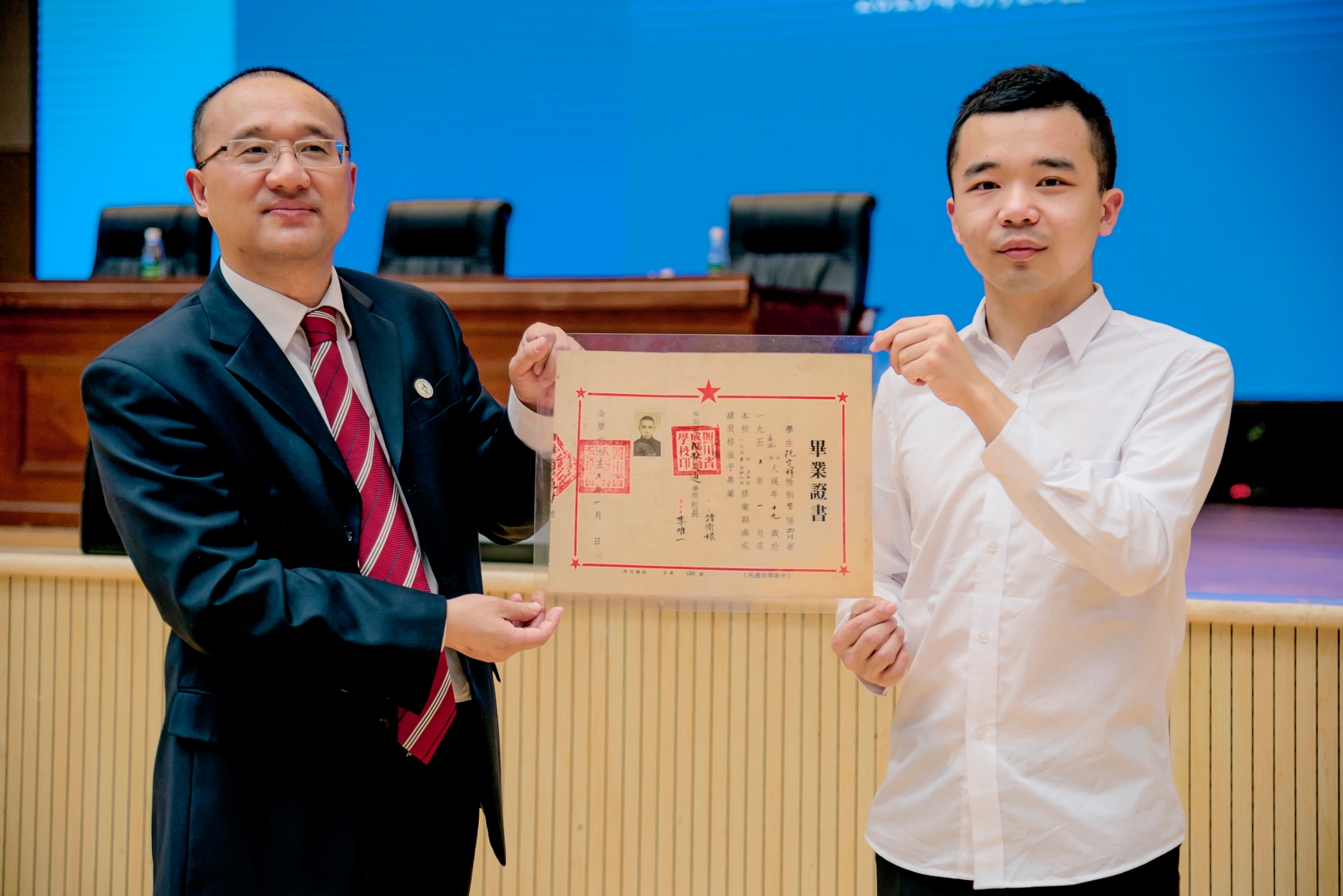 当校友暨家属代表阮强带来了学院第一届毕业生的毕业证书,并捐赠给学院时,关于历史的记忆,关于精神的传递,便流淌于弘毅馆中。蒋永林代表学院上台,接受了毕业证的捐赠。