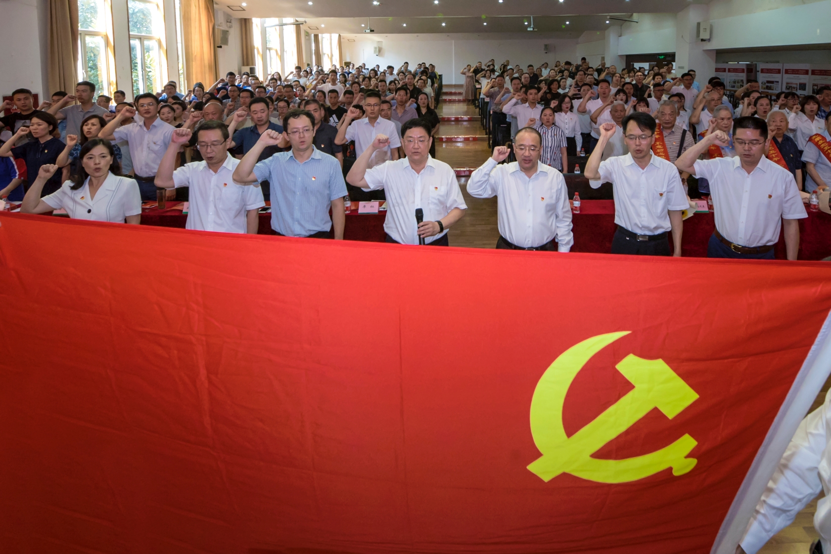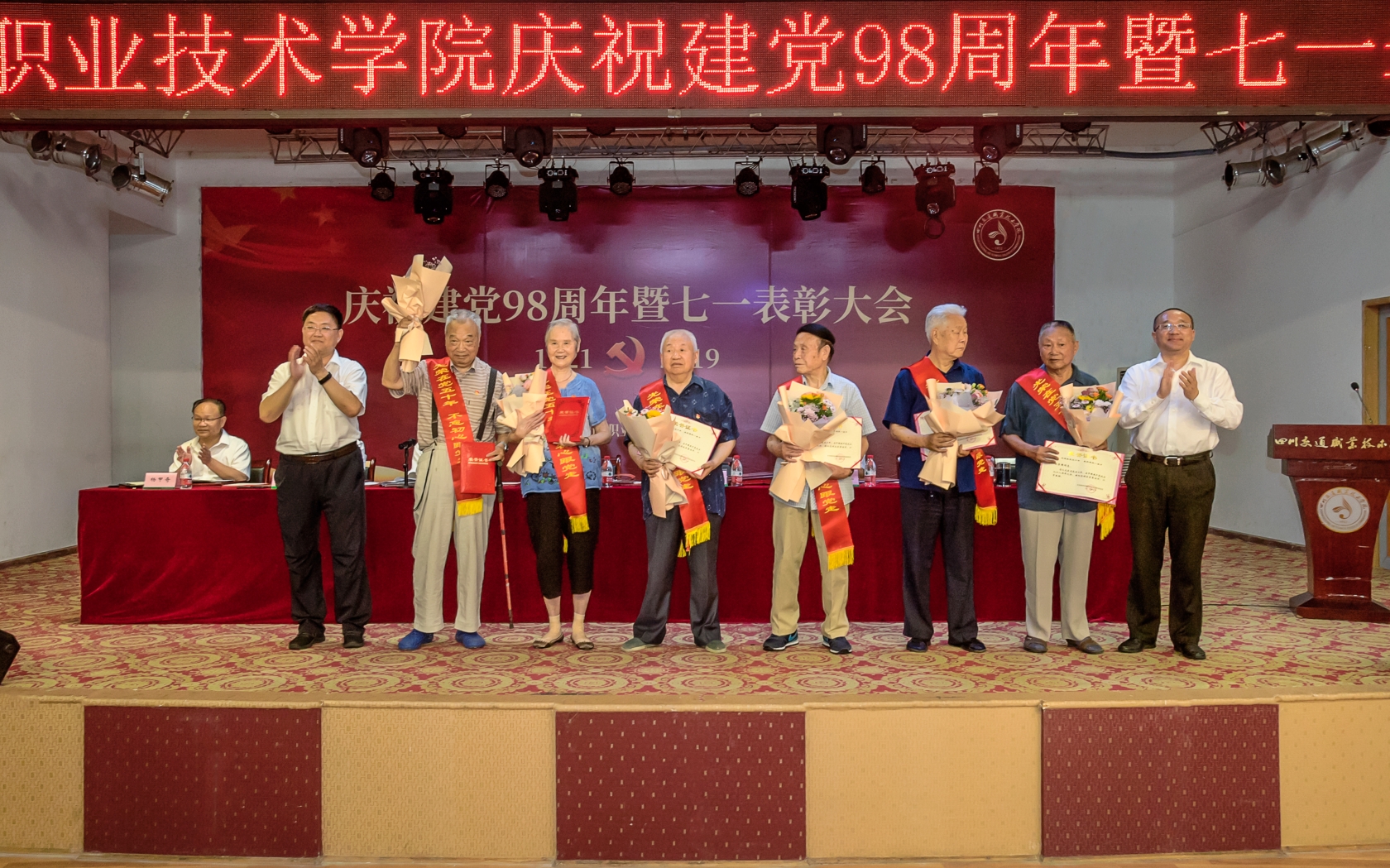 7月1日,雄壮的国歌声在四川交职院多功能厅响起,庆祝中国共产党诞辰98周年暨七一表彰大会举行,会议回顾我党成立与发展的奋斗历程,展望党和人民事业发展的光明前景,表彰在学院工作和交通事业发展中涌现出的18个先进基层党组织、30名优秀党务工作者、46名优秀共产党员,为46名光荣在党50年的老党员佩戴绶带,颁发了荣誉证书。2018年新发展教职工党员集体宣誓、全体老党员重温入党誓词。学院党委副书记、院长蒋永林主持会议。
