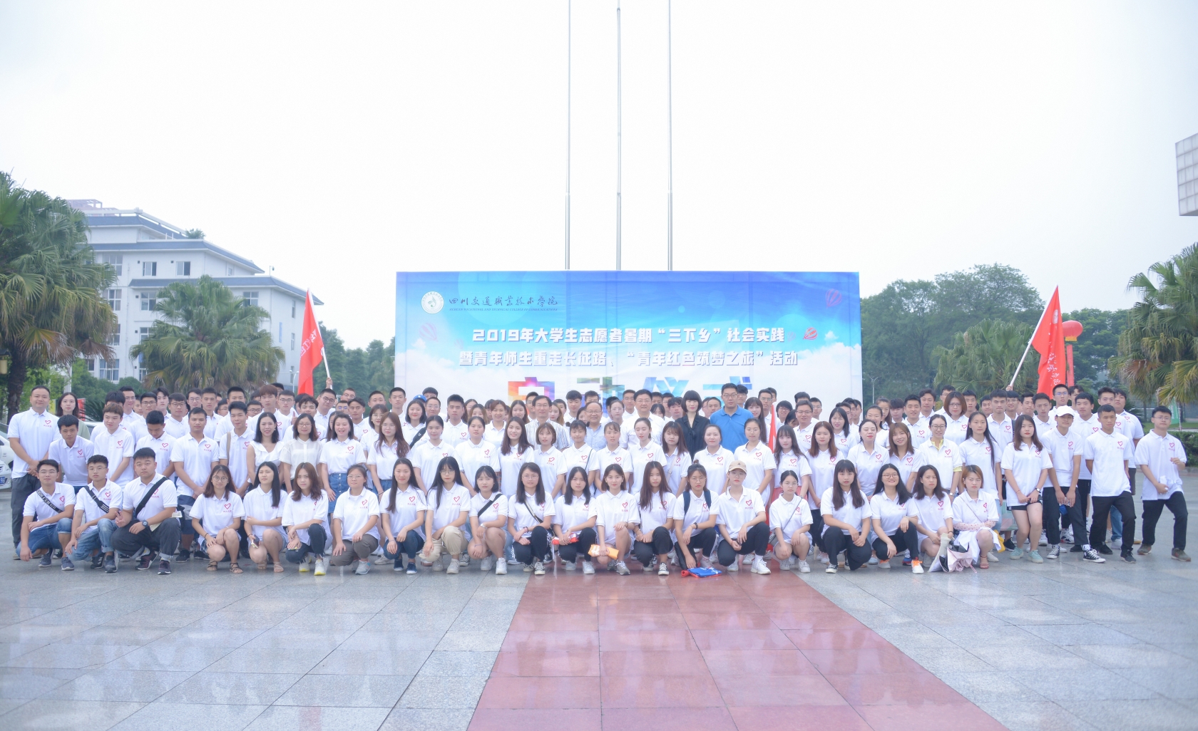 7月9日上午,四川交职院在紫毫广场举行2019年大学生志愿者暑期“三下乡”社会实践暨青年师生重走长征路、“青年红色筑梦之旅”活动启动仪式,学院党委书记王东平为“青年师生重走长征路”团队授旗,副院长杨甲奇为暑期“三下乡”社会实践团队代表、“青年红色筑梦之旅”团队代表授旗。