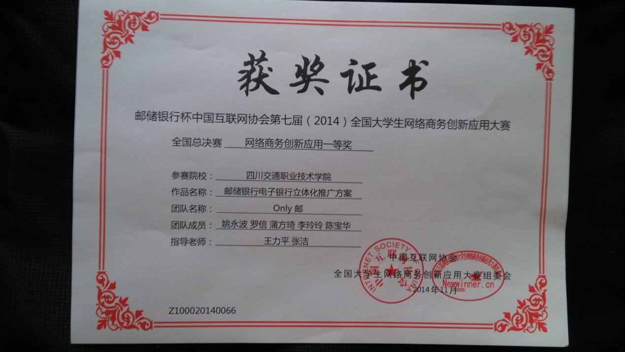 12月1日,邮储银行杯第七届全国大学生网络商务创新应用大赛总决赛在北京邮电大学落下帷幕。由我院运输工程系李玲玲、陈宝华、蒲方琦,经济管理系姚永波、罗信同学组建的代表队“Only邮”,在来自全国289支队伍中脱颖而出,获得全国大学生网络商务创新应用大赛全国总决赛一等奖。