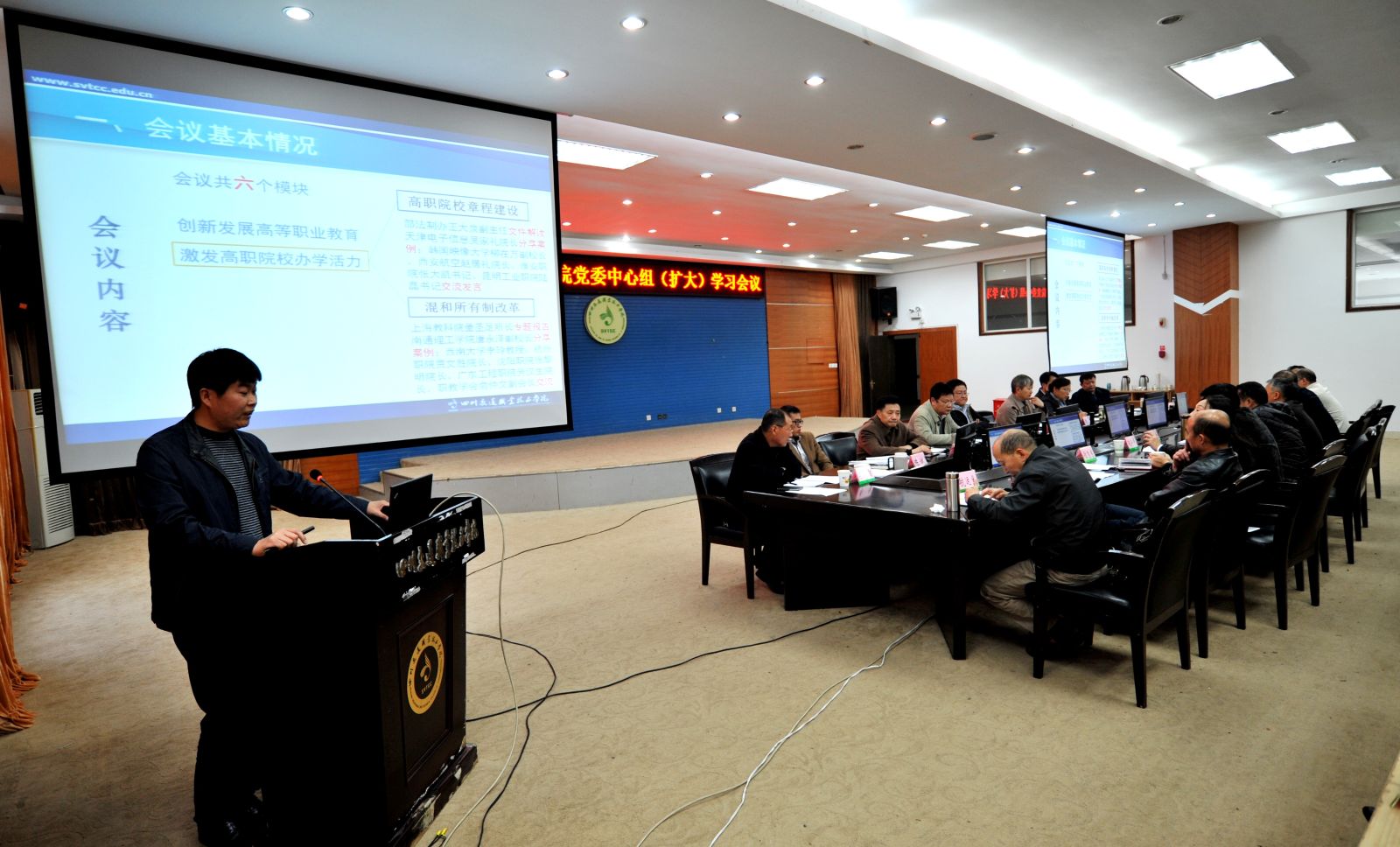 图为教务处处长秦兴顺传达2014年全国高职高专校长联席会议精神