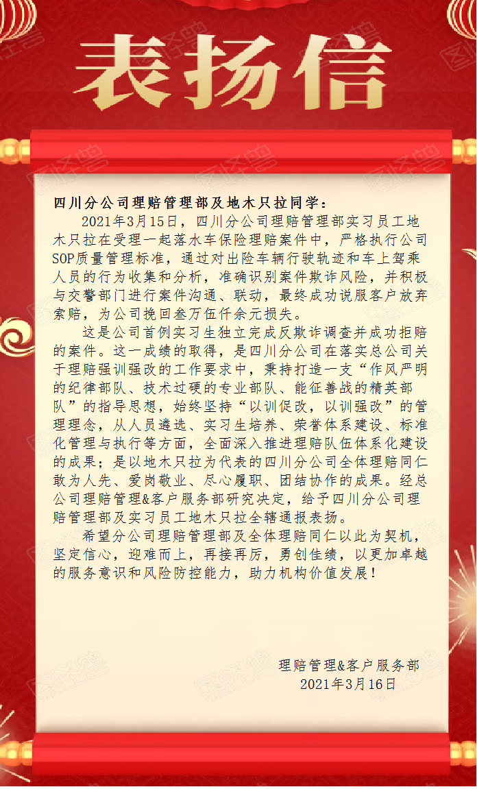 3月16日,诚泰财产保险股份有限公司四川分公司发布全辖区通报表扬信,其理赔管理部实习员工地木只拉在受理一起落水车保险理赔案件中,严格执行公司SOP质量管理标准,通过对出险车辆行驶轨迹和车上驾乘人员的行为收集和分析,准确识别案件欺诈风险,并积极与交警部门进行案件沟通、联动,最终成功说服客户放弃索赔,为公司挽回叁万伍仟余元损失。