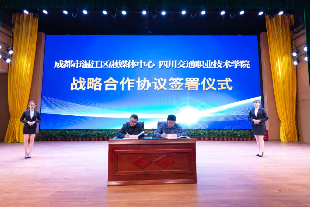 会上,学院与温江区融媒体中心签订校地合作战略协议。根据协议要求,学院“饺子”融媒将成立温江融媒高校工作站,为温江融媒在新闻生产、业务培训、学术研讨等方面提供支持,温江区融媒体中心将挂牌成为学院校地合作单位,并为学院学生实习、实训提供支持。
