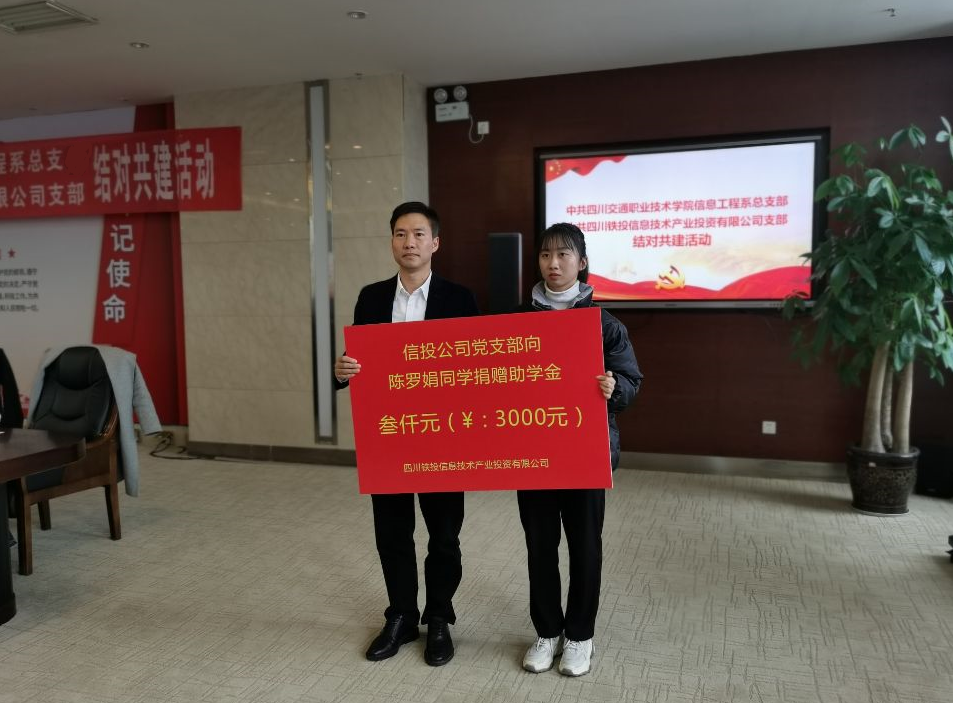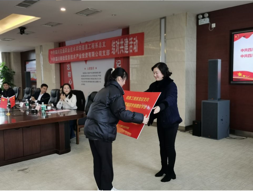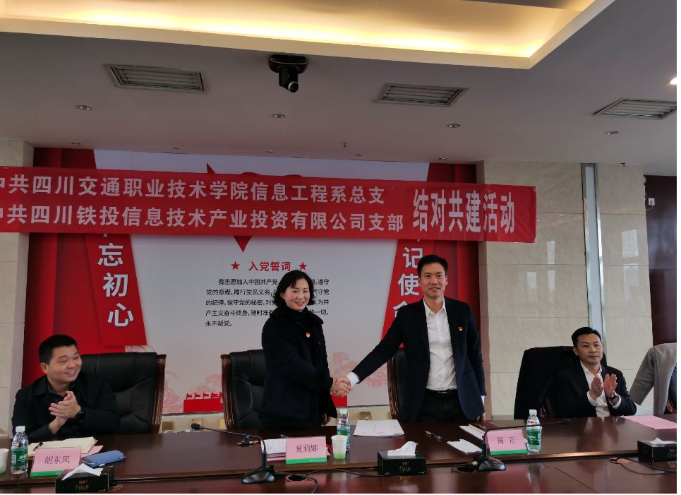 会上,周正书记、夏莉娜书记分别对公司党支部和系党总支基本情况做了详细介绍,对基层组织建设促进双方业务工作和下一步全方位合作进行了深入交流。夏莉娜书记在会上就双方如何携手共创未来提出了三点建议:一是以支部共建为桥梁,以共创共享为路径。双方以支部共建备忘录为依托,定期开展双方支部共建;二是以交通行业为背景,以信息技术为纽带。我系与四川铁投信息技术产业投资有限公司有着天然的亲切感和共同点,未来合作期待满满。三是以专业建设为龙头,以服务行业为目标。探索建立混编师资团队,提高校企双方人才队伍的能力和水平。为学生提供相应的顶岗实习机会或就业机会,提高学生就业的质量。共同开展或开发信息技术技能培训、竞赛以及研究成果转化,共育高素质技术技能型交通强国人才。校企双方就支部共建共创达成共识,并现场签订了《支部结对备忘录》。