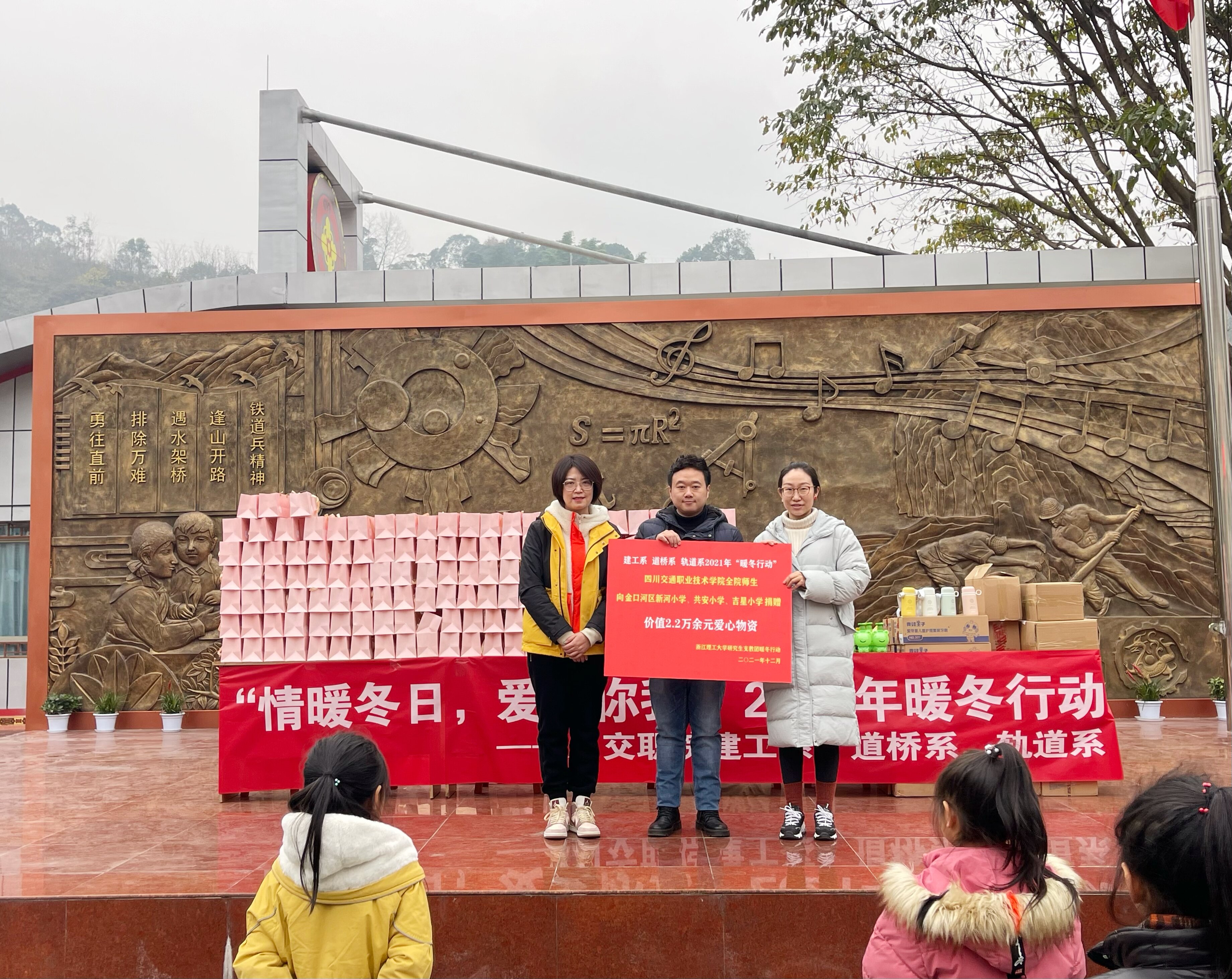 活动共募集爱心善款2.2万余元,购买了保温杯、洗漱包等爱心物资,由三系师生代表于12月14日送达金口河区。新河小学教导主任、浙江理工大学研究生支教团团长、副团长及各受捐学校代表参加了捐赠仪式。