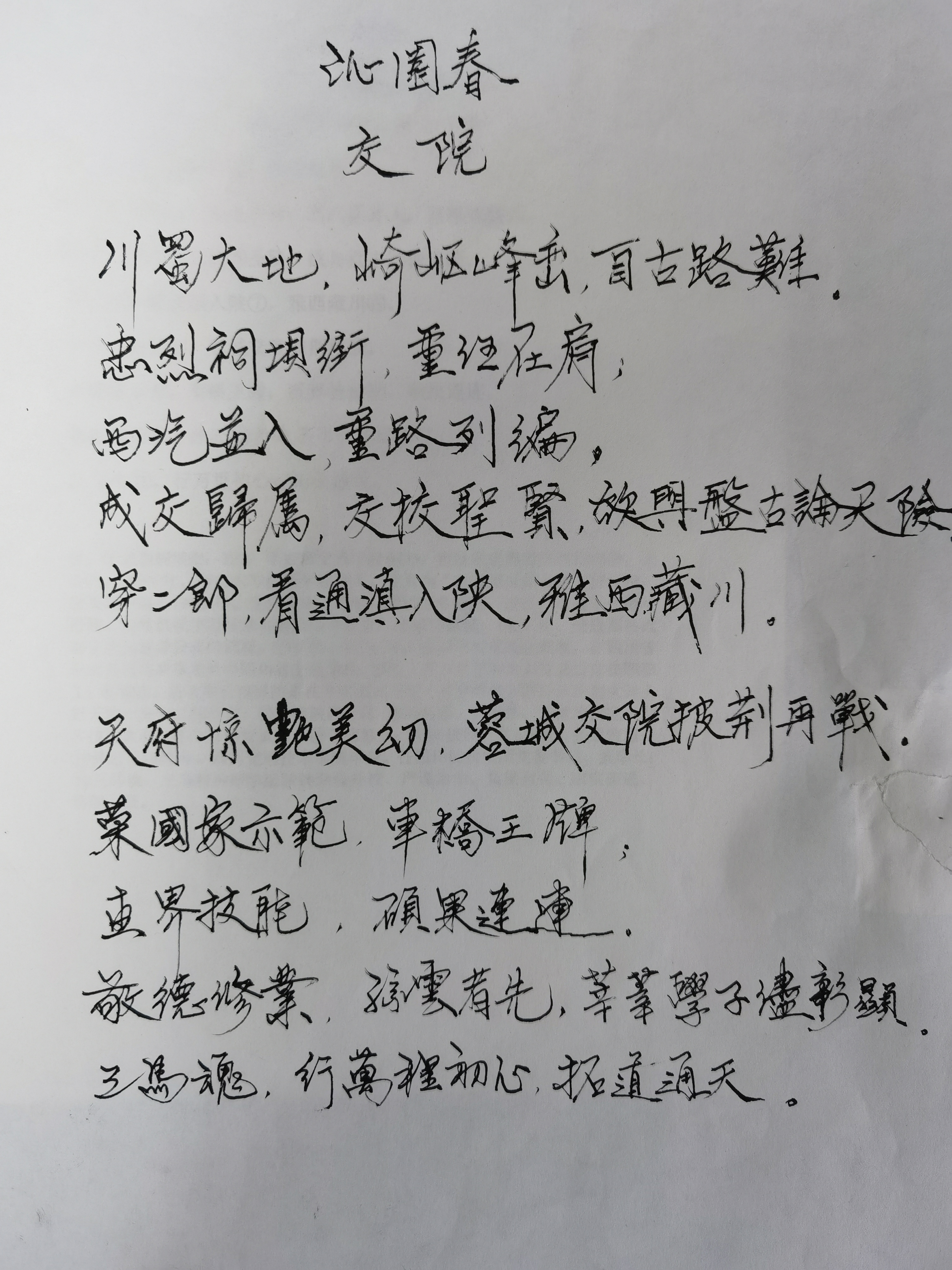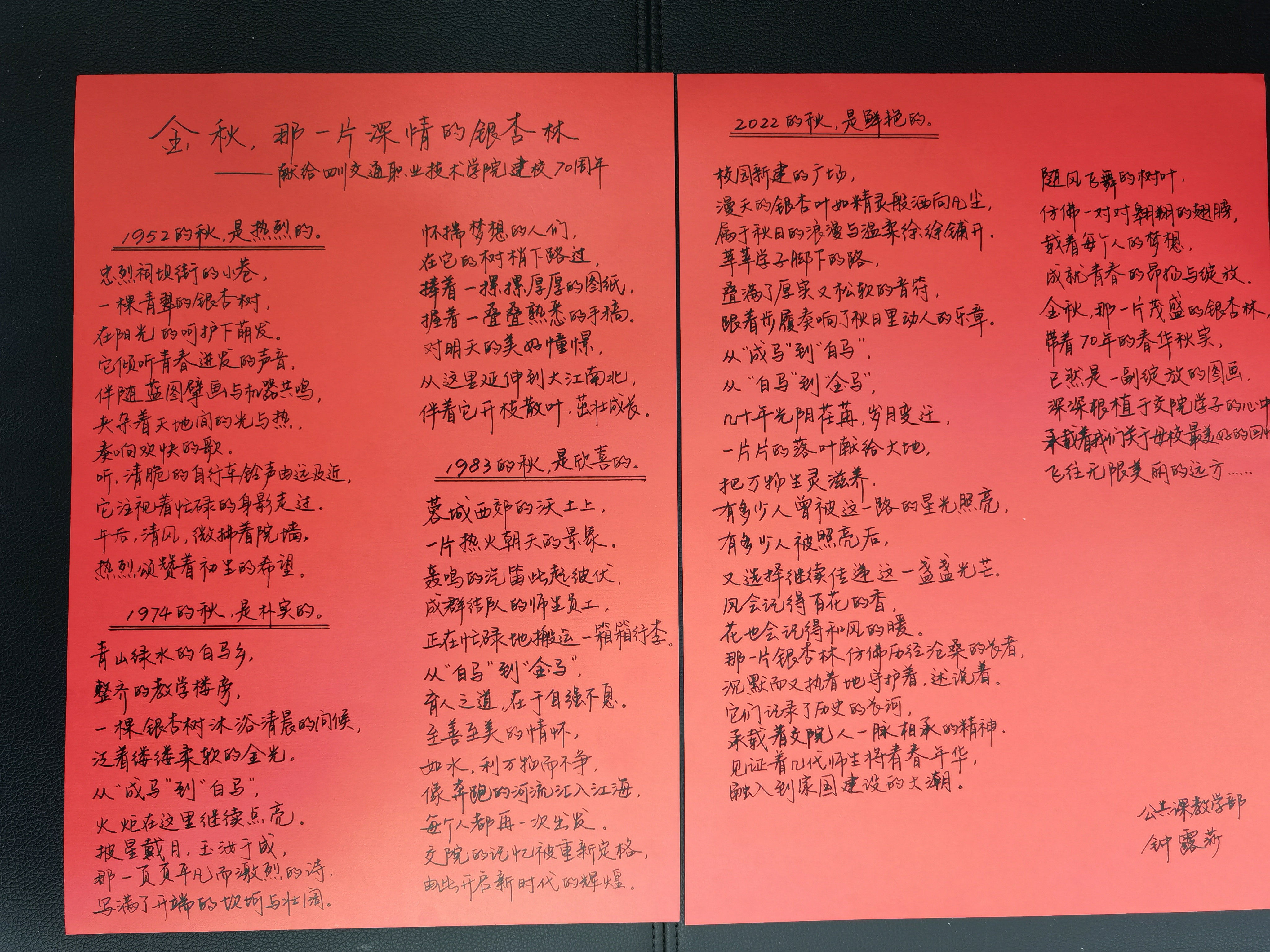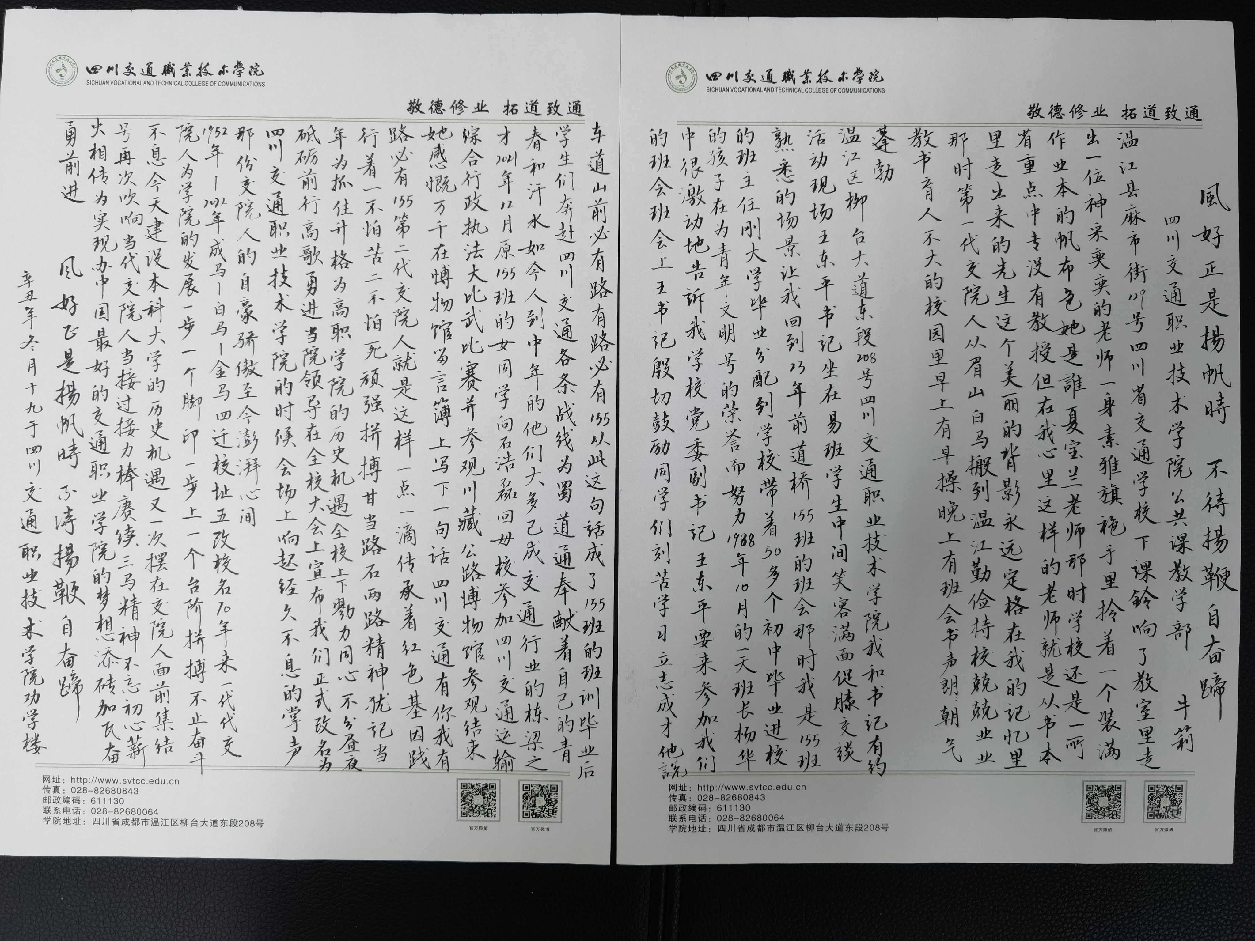 七十载春秋砥砺前行,一代代交院人不忘初心、牢记使命,为我蜀道、为我大交通奉献毕生力量。时值学院70华诞之际,学院广大师生纷纷用自己手中的笔,或创作诗歌,或发表议论感触,或叙写身边感人的不普通的普通人普通事,用一篇篇作品为校庆献礼。