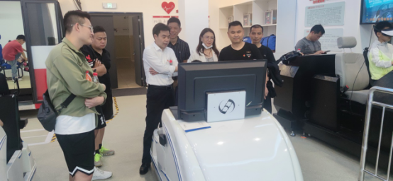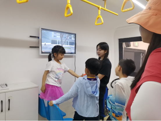 在观看完交通安全宣传视频后,基地讲解员涂子学带领参观者一路参观交通安全科普基地。讲解员为参观者介绍道路交通标志,并通过抢答识别交通标志小游戏,AR互动学习交警指挥手势,增强了活动的趣味性。在基地内,参观者模拟体验了在道路上驾驶汽车和电动车,还佩戴VR眼镜体验酒驾、疲劳驾驶等危险驾驶行为,以及进行了公交车起火逃生演练。整个活动过程,每位参观者都积极参与,现场干货满满,氛围热烈。