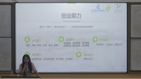 两位老师分别从自身指导双创项目的经验出发,为参加活动的同学们进行了“如何才能有效地进行创新思维培养”、“如何从公益创就业思维下走属于自己的自就业之路”等主题分享。