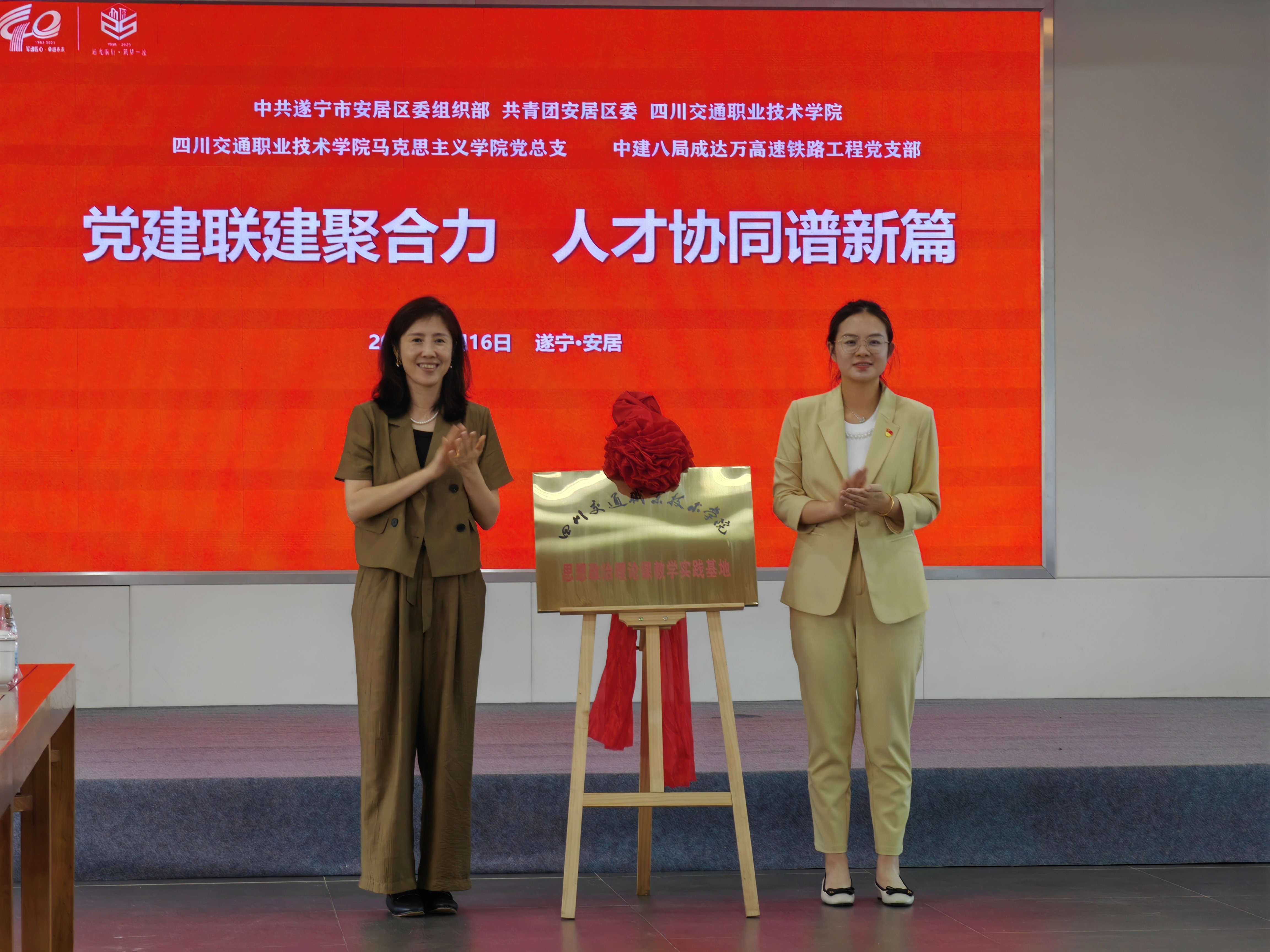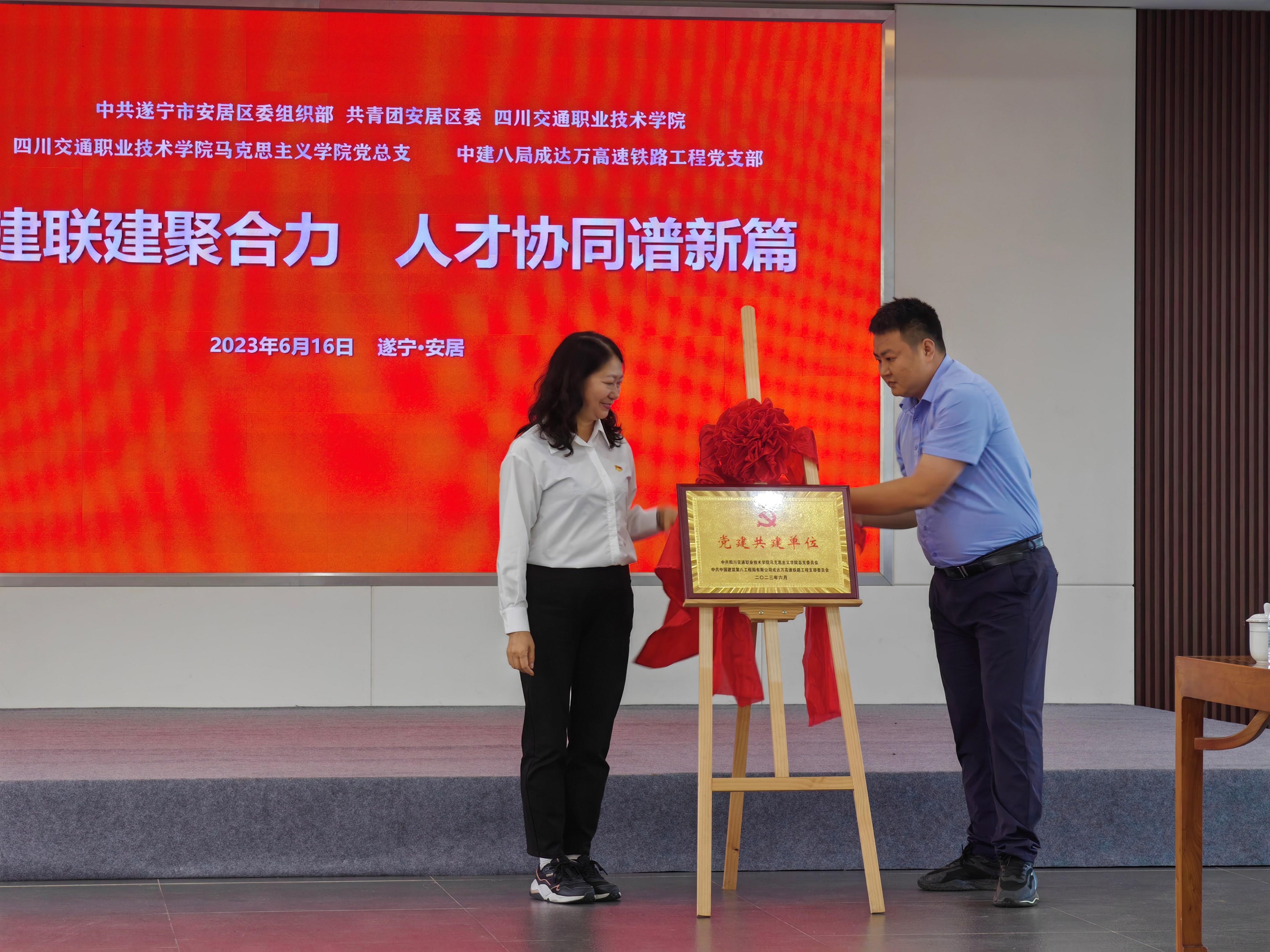 6月16日,马克思主义学院与遂宁市安居区、中建八局成达万高速铁路工程指挥部在遂宁市安居区海龙村会议室共同举行“党建联建聚合力人才协同谱新篇”校政企党建共建活动。活动旨在以党建为引领,实现“资源共享、优势互补、深度融合、发展共赢”。学院党委副书记、纪委书记鞠敬,遂宁市安居区委组织部副部长、公务员局局长唐春燕、区委非公经济和社会组织工委专职副书记唐兰、共青团安居区委书记杨琦、成达万高速铁路工程党工委书记、工会主席董艳秋,党工委委员、副指挥长李强华,工程指挥部工会副主席李鹏翔、工程第三工区总工程师樊有方以及马院党总支全体党员参加。