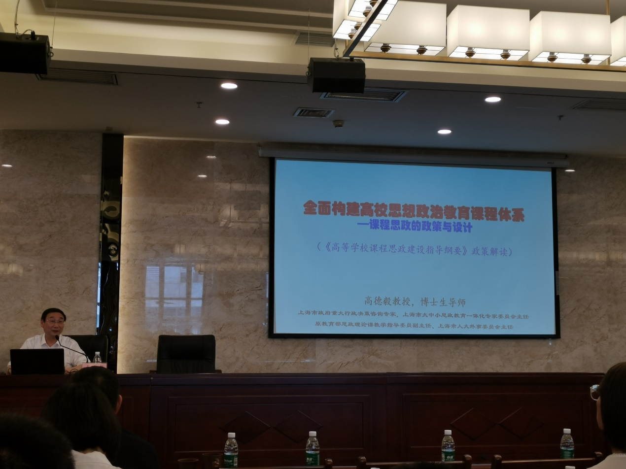 为进一步全面构建高校思政教育课程体系,更好地提升教师挖掘课程思政元素的能力,提升课程思政教学效果,近日,由学院教务处、学院课程思政教学研究示范中心及徐文名师工作室承办的专题讲座——《全面构建高校思想政治教育课程体系——课程思政的政策与设计》在明德楼B319会议室顺利召开。此次讲座邀请到上海市政府重大行政决策咨询专家、上海市大中小思政教育一体化专家委员会主任、原教育部思政理论课教学指导委员会副主任、上海市人大外事委员会主任高德毅教授。讲座由学院课程思政教学研究示范中心主任王东平教授主持,学院各系的领导及专业课教师、马院教师参加了此次讲座。