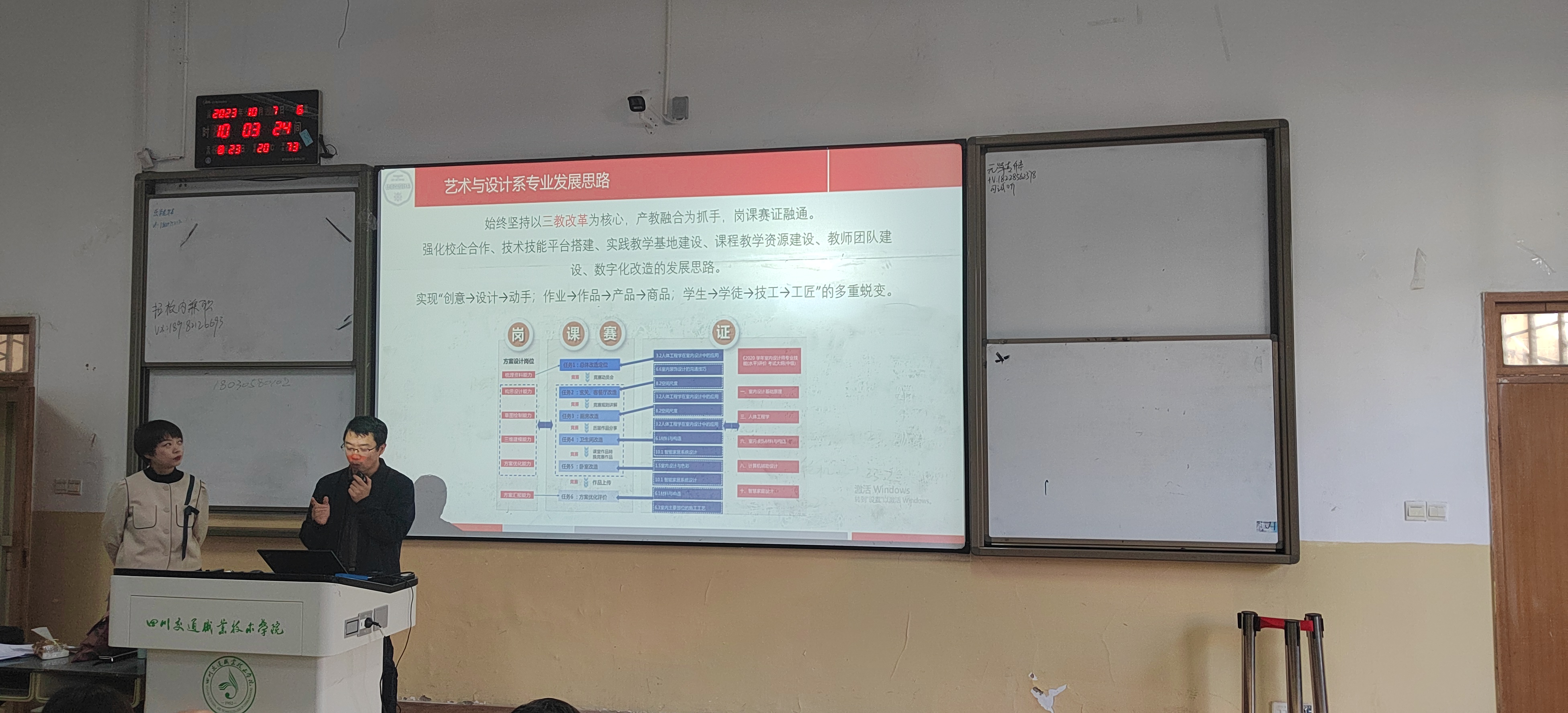 艺术与设计系主任谭亮从院系基本情况、社会服务贡献、办学特色亮点等方面进行了介绍,并对新一届同学们的大学生活给予勉励和期望;艺术与设计系党总支书记胡其良从艺术与设计系人才培养模式、实训条件、教学成果等方面介绍了系发展情况,从理想信念教育的角度为新生们上了一堂生动的思政课;