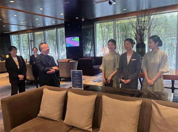 最后,系走访小组在酒店方的陪同下,到各岗位上参观实习生工作环境、实践操作情况。并看望了2023届毕业生程茂旭,程茂旭同学毕业后已转为前厅部正式员工,并作为酒店实习老师指导帮助新一届的实习生。