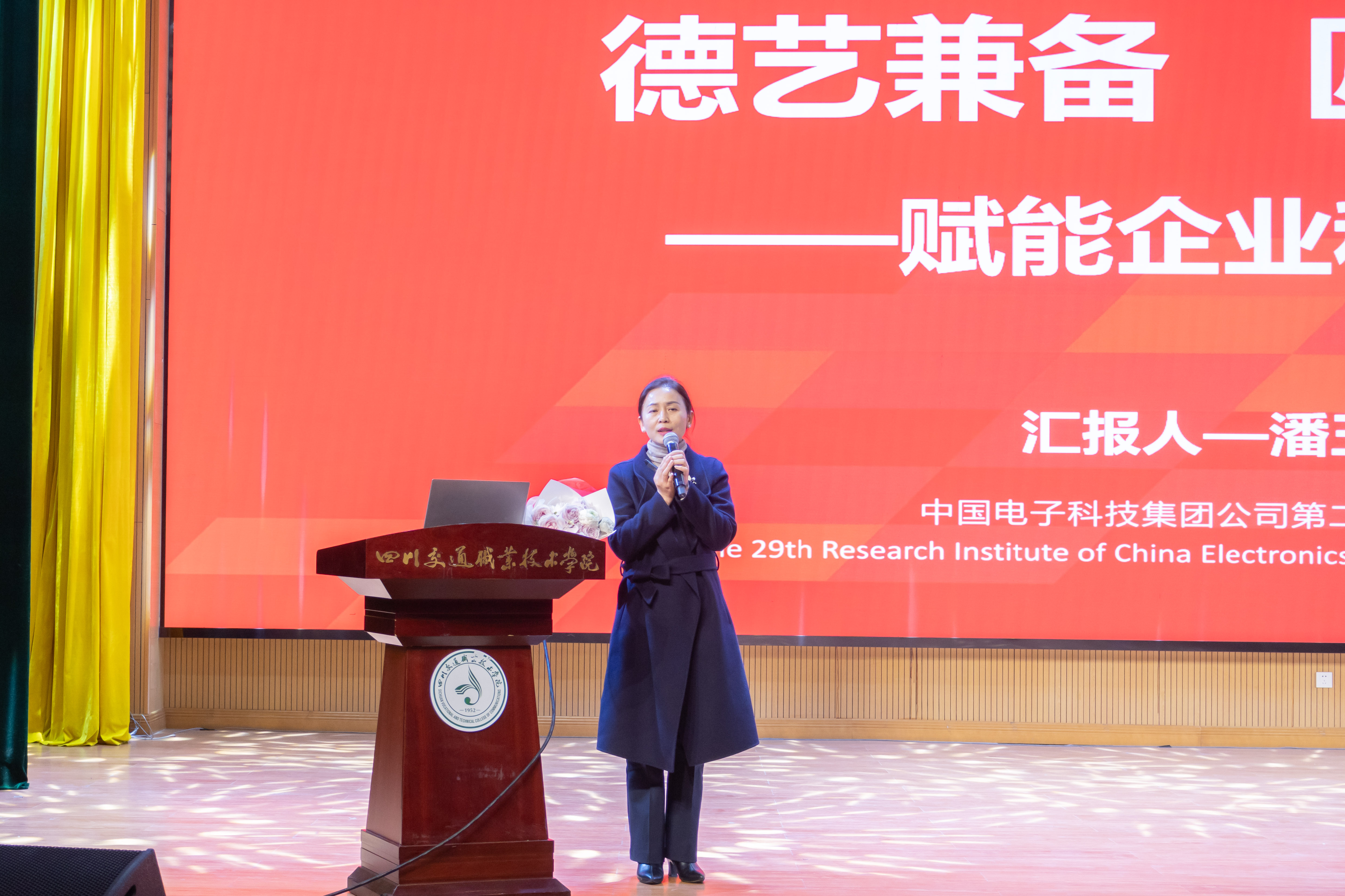 “干一行、爱一行、钻一行、精一行,我从最基础的工作做起,一步步地给自己设定‘小目标’,然后不断努力实现,最终走到了今天。”大国工匠、全国五一劳动奖章、中华技能大奖获得者、中国电子科技集团公司第二十九研究所高级技师潘玉华凭借着“学习、专注、担当、奉献”,以自己对工匠精神的践行及独特解读,为四川交职院的师生们讲授《德艺兼备 匠心前行》,激励师生们要弘扬工匠精神,厚植工匠文化。