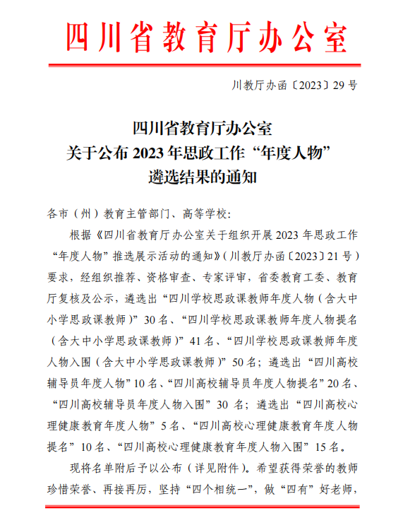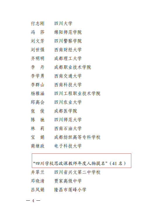 推选展示活动开展以来,经组织推荐、资格审查、专家评审,省委教育工委、教育厅复核及公示,评选出“四川学校思政课教师年度人物提名(含大中小学思政课教师)”41名。