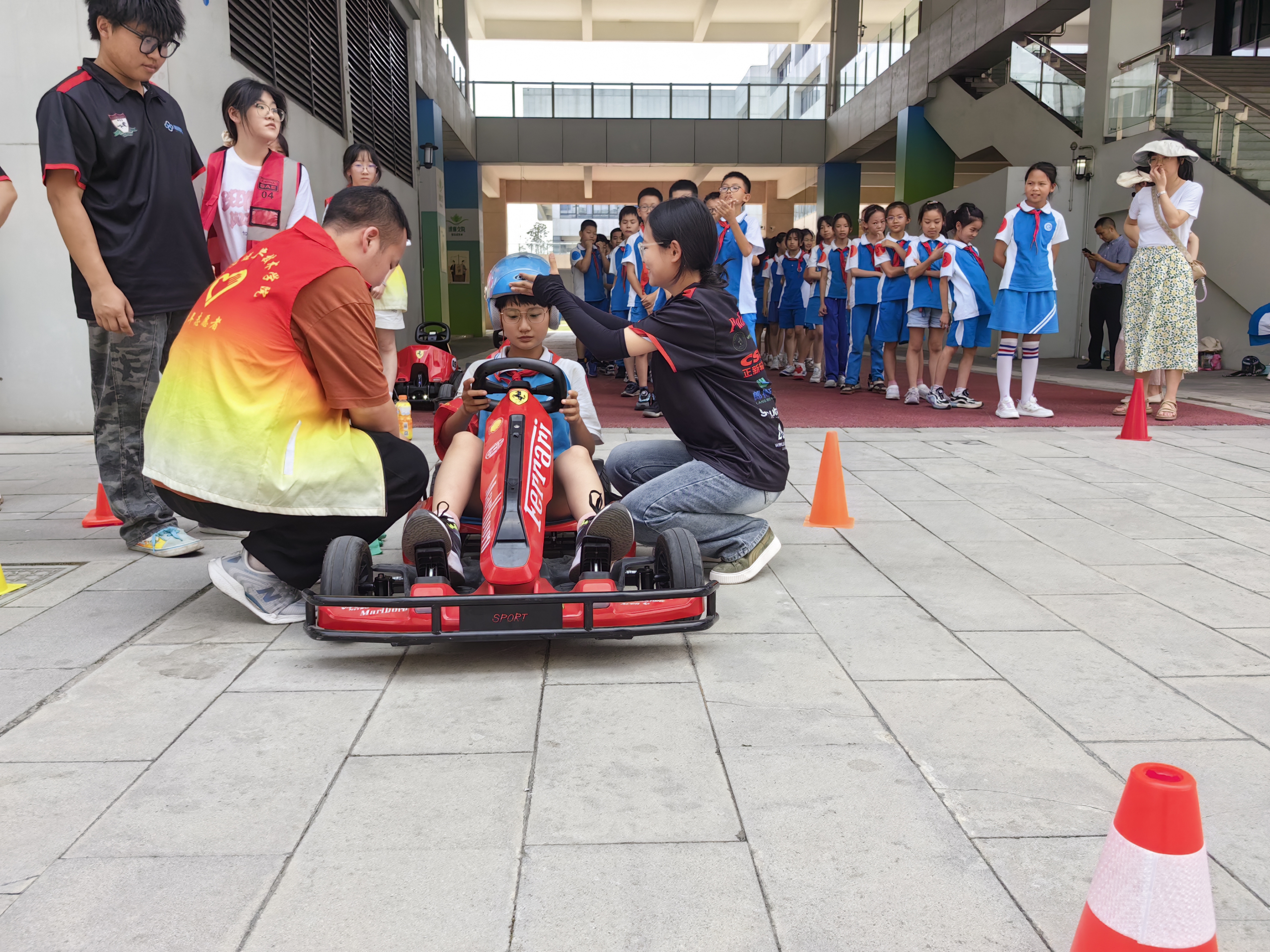 在赛车科普小讲堂中,郭旭峰老师以巴哈赛车为例,生动有趣地向同学们介绍了赛车的特点、结构和赛车服、头盔、五点式安全带等安全装置的科学原理,并邀请同学坐在赛车驾驶舱中体验穿戴五点式安全带,让同学们直观地了解安全保护装置在比赛过程中对赛车手进行保护的原理。在本环节的最后,郭老师向同学们进行了赛车信号与旗语的科普,向大家展示赛车旗帜的使用方法,为模拟赛事体验课做准备。
