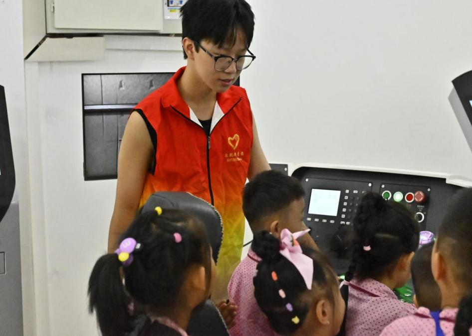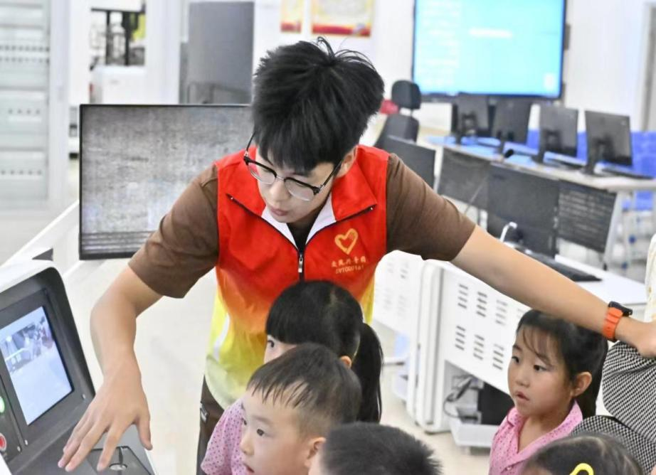 在体验环节中,轨道系志愿者们带领小朋友们操控地铁模拟驾驶系统,从司机的视角体验了地铁是如何操纵和运行的。在这个过程中,志愿者向他们讲解了如何控制列车速度、如何平稳减速对标停车等技巧,小朋友们听得十分认真。志愿者们耐心地解答着孩子们提出的各种疑问,帮助他们更好地理解城市轨道交通知识。最后,志愿者给孩子们分发纪念品,鼓励他们在未来的学习和生活中坚持不懈,勇敢追梦。