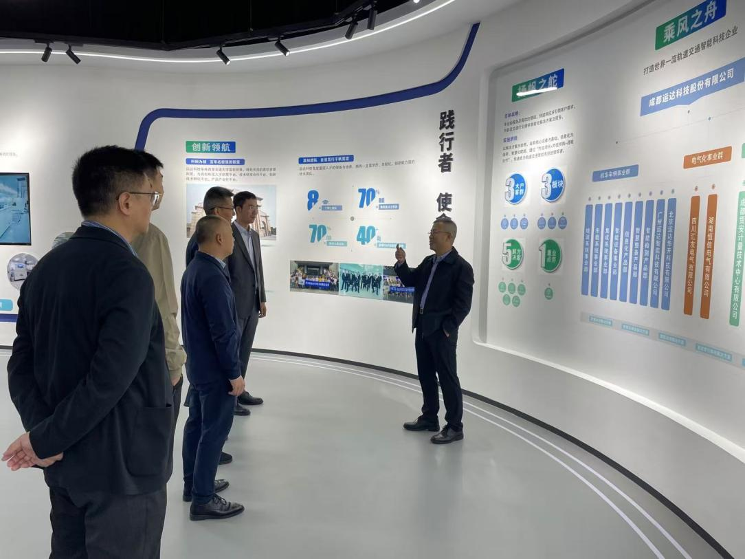 成都运达科技股份有限公司党委书记江海涛带领学院一行参观了展厅,并详细介绍了公司的发展历程、企业文化及近年来取得的成就。相关工作人员现场展示了城轨车辆模拟驾驶器、模拟检修、数字化运维系统等一系列智慧培训工具的使用。