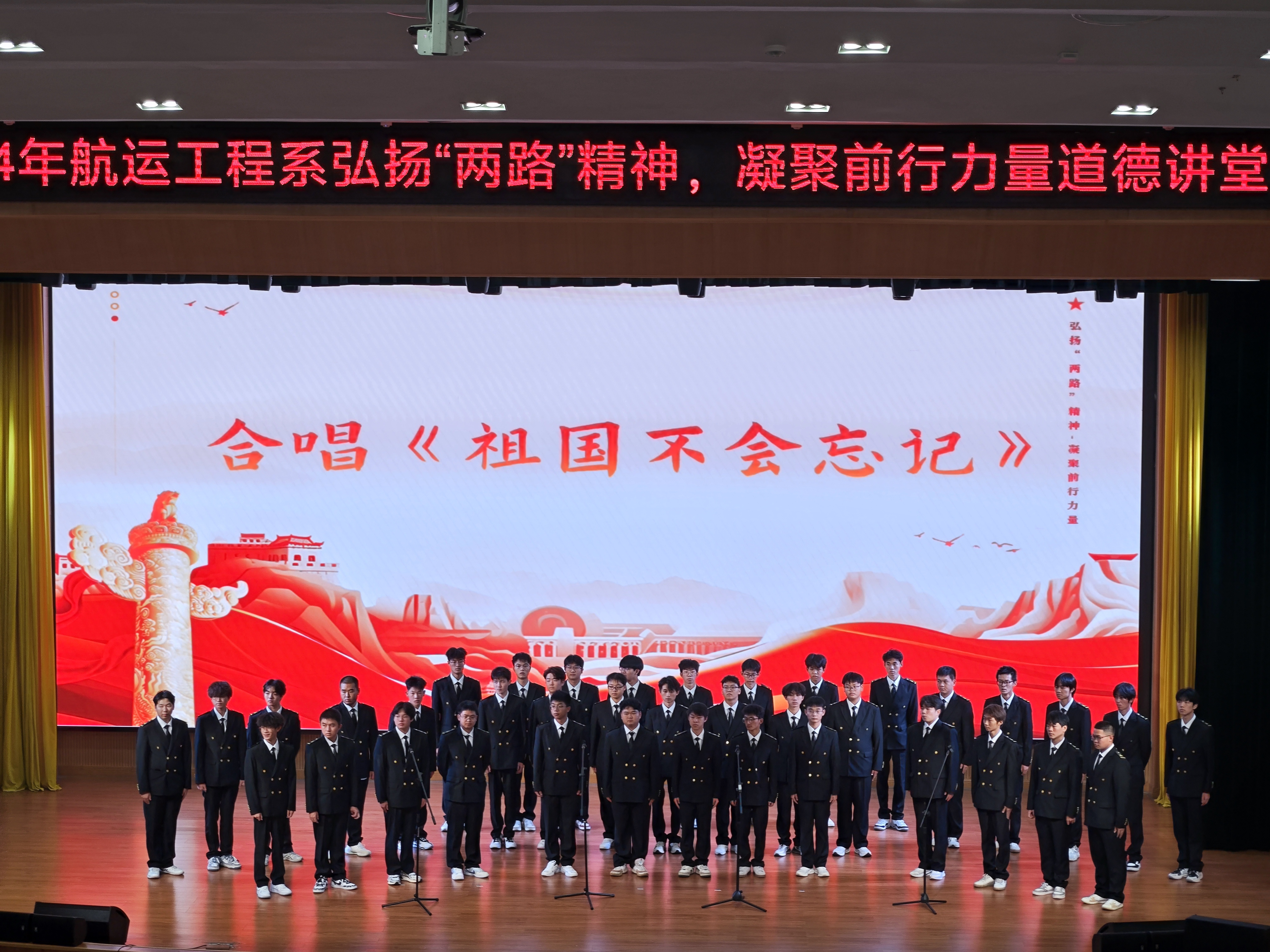 本次道德讲堂活动由七个环节组成:唱一首歌,合唱《祖国不会忘记》;讲述一段故事,老兵冯宇讲述属于自己的“两路”精神故事;增强一份信念,情景剧表演《浪花里的铺路石》;明白一番道理,朗诵《永恒的丰碑》;崇尚一份道德,访谈文军先进事迹,筑“两路”精神;力行一份使命,重温海员誓词;交流一份感想,师生交流感悟,分享心得。通过以上环节的演绎,充分体现了 弘扬“两路”精神,凝聚前行力量的主题。
