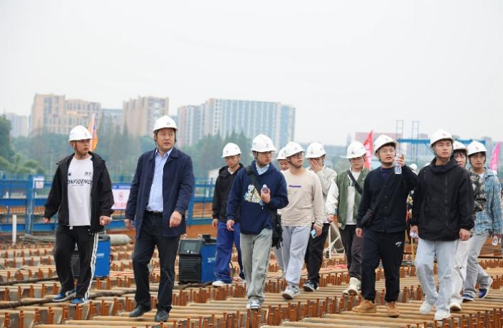 学术报告会后,匍匐班学员前往参观正在建设中的成乐扩容高速公路高架桥施工现场,施工现场桥梁技术人员讲解了桥梁建设关键技术。