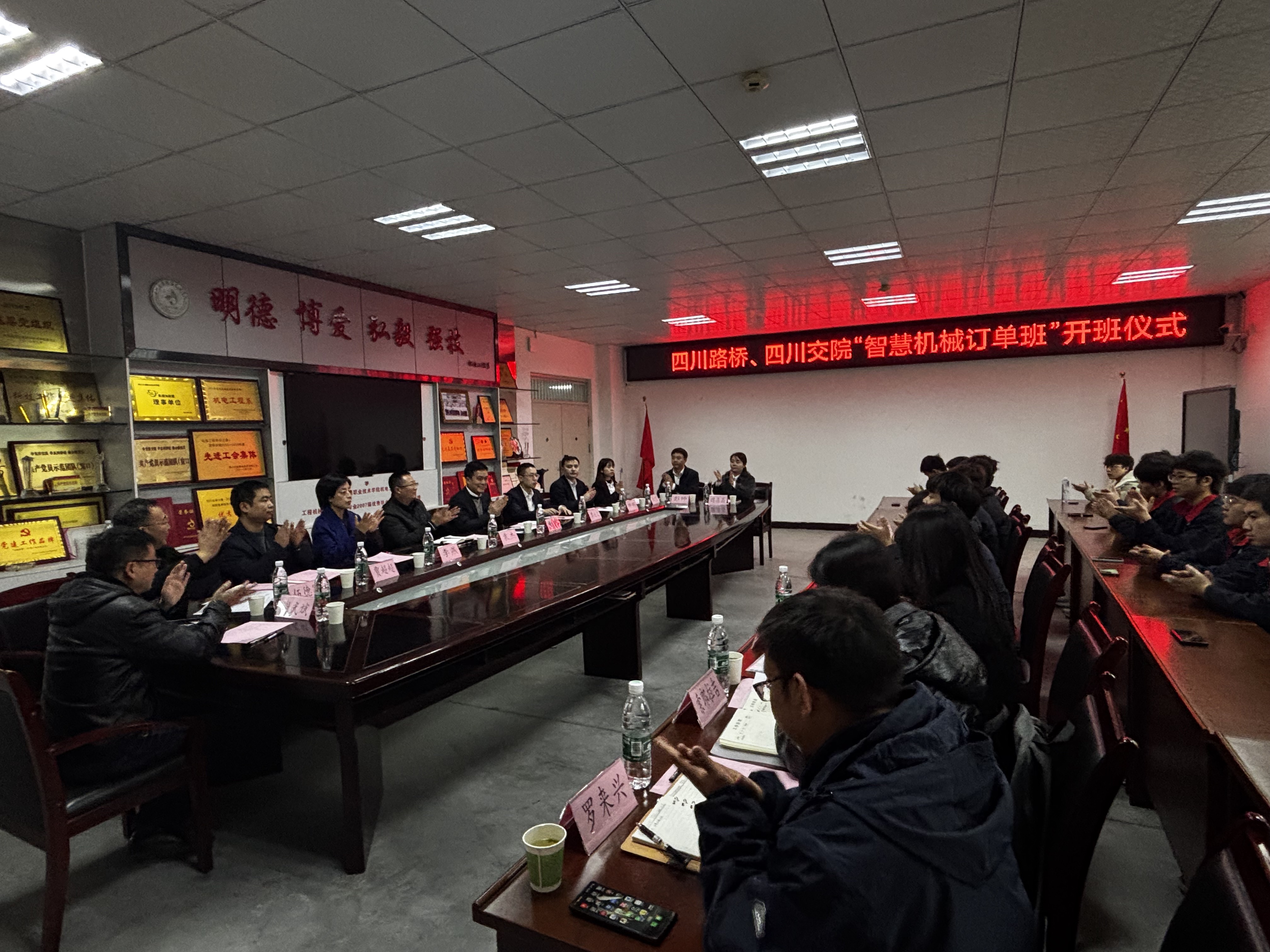 12月5日,四川公路桥梁建设集团有限公司“智慧机械订单班”开班仪式在我院践行楼B302会议室举行。路桥集团人力资源部副部长黄能新带领大桥公司、二分公司、三分公司、隧道公司、机化公司等单位人力资源负责人参加本次会议,我院副院长袁杰及招生就业处、教务处、机电工程系主要负责人出席开班仪式。