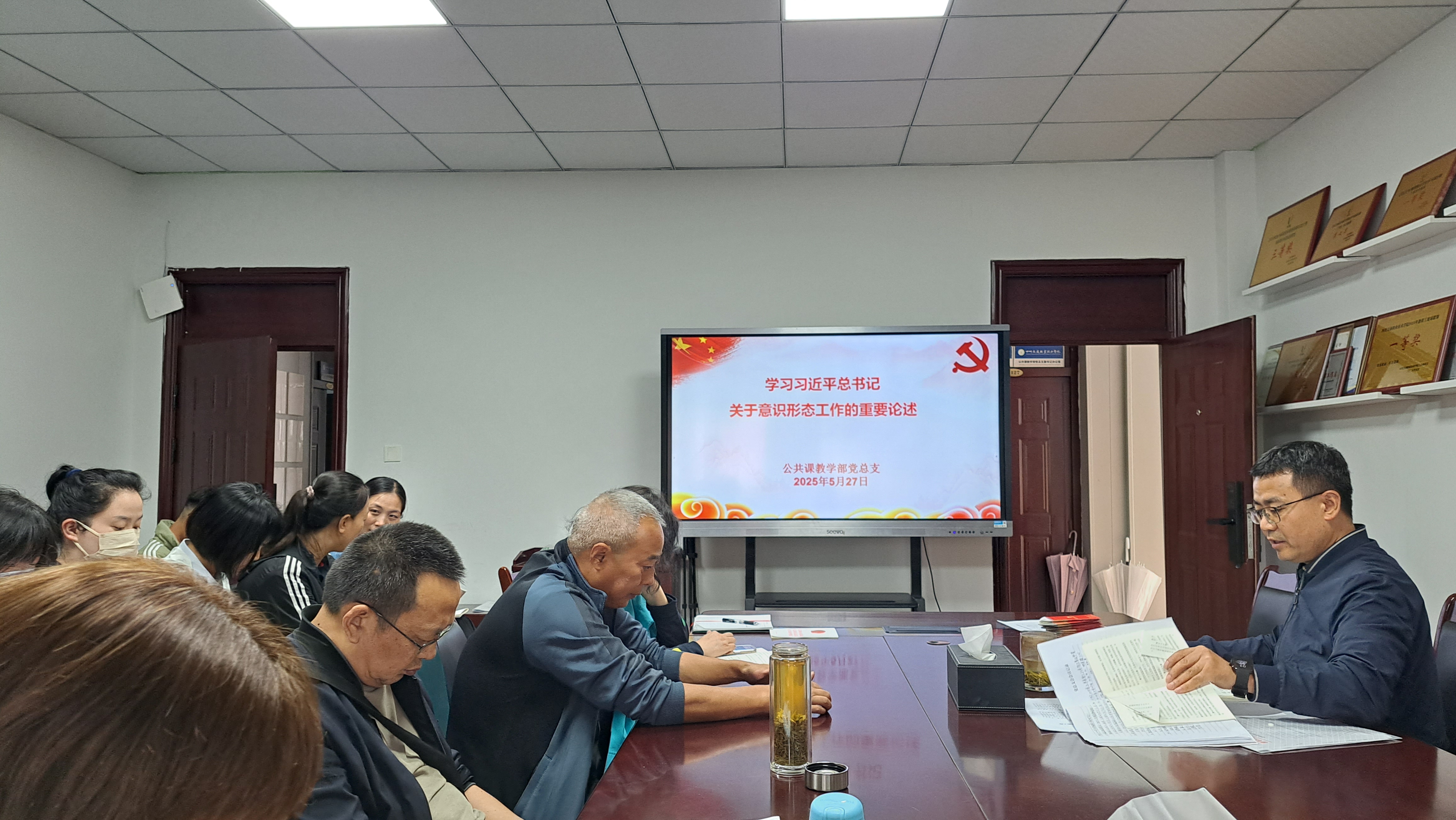 公共课教学部党总支于2025年5月27日下午组织教职工进行了政治学习会议,内容涵盖习近平总书记重要讲话精神、意识形态工作、法律法规以及党员干部行为规范等多个方面。