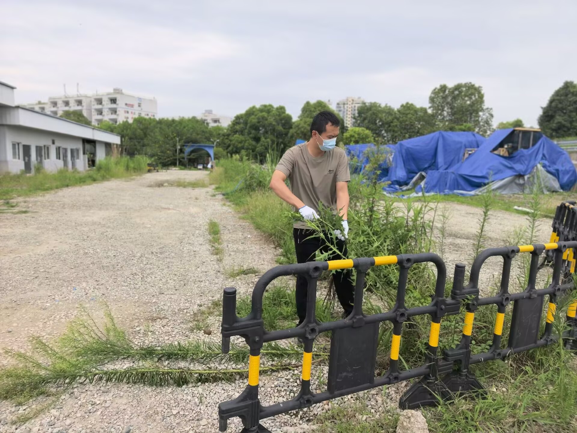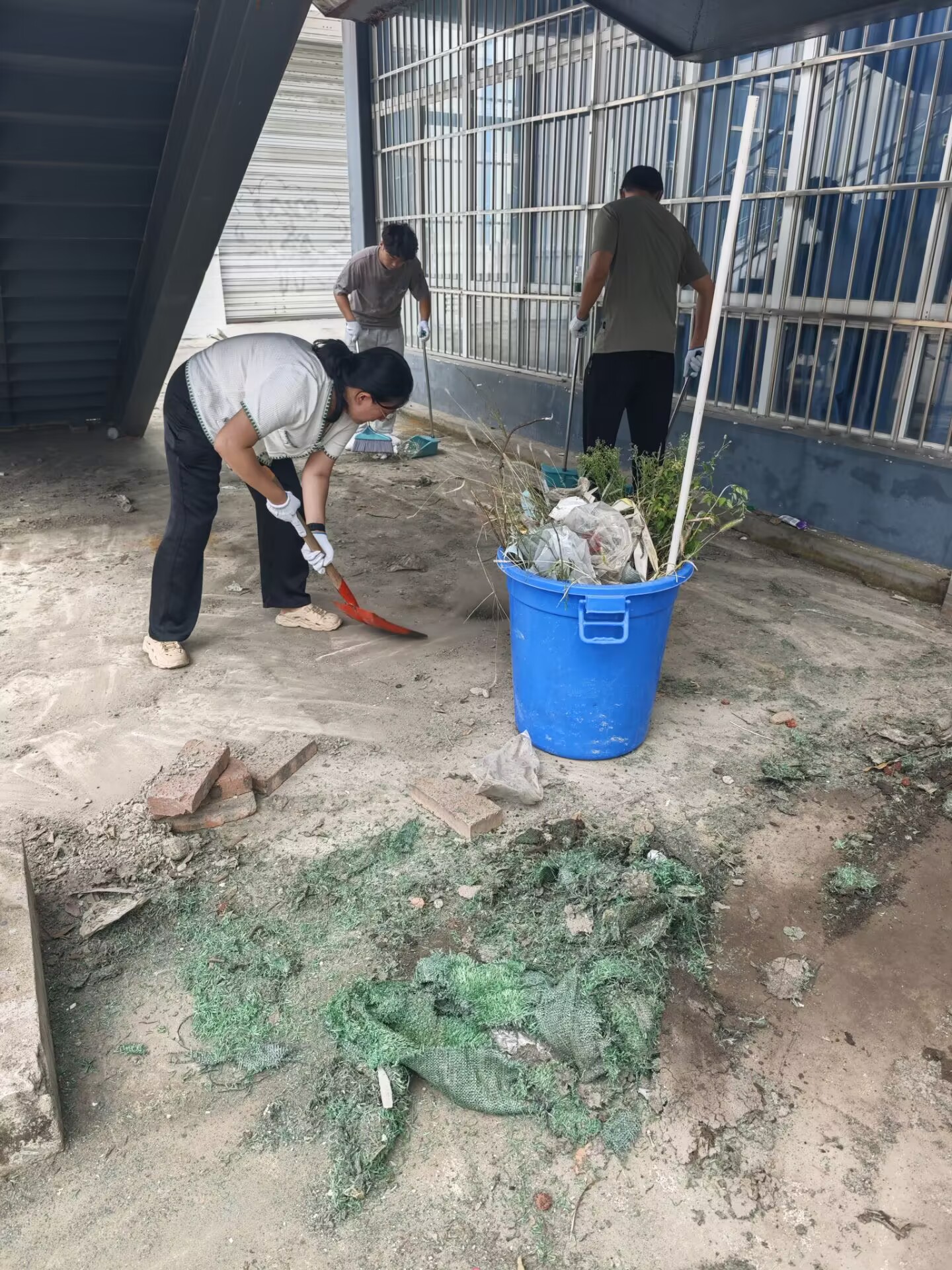 杂草清除组针对实训中心外围绿化带、围墙边角的杂草枯枝展开集中清理,党员同志们手持镰刀、铁锹等工具,历时2小时完成2000余平方米区域的杂草清除工作,并对地面淤泥进行铲除。