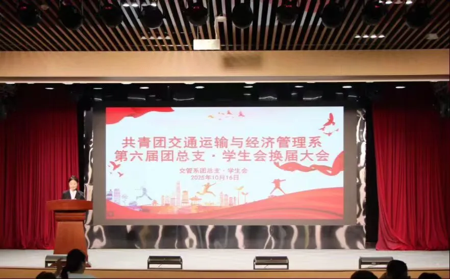 2025年10月16日,交通运输与经济管理系(以下简称“交管系”)第六届团总支·学生会换届大会在博学馆路演厅召开。交管系团总支书记杨金兰、学生干事赵偲宇、全体辅导员,以及23级、24级、25级团总支·学生会成员共同参会,见证系学生组织干部队伍的新老交替。