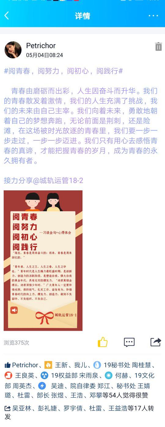 轨道系2018级、2019级各团支部全员参与,累计浏览量共计5700次,累计点赞量达1586次,累计转发量220次。作为“青年大学习”课外延伸阅读,立足习语,结合自身专业与行业精神,在班级与班级之间开展网络平台分享接力。同学们以深刻的心得体会、生动的海报设计、丰富的视频创作等趣味形式展开接力,各参赛团支部发布分享内容后并标注@下一个参赛团支部,依次类推,最后回到分享发起团支部形成闭环。