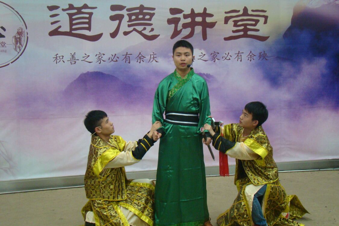 活动以28名同学高唱公民道德歌拉开帷幕,并围绕“义”的主题,开展了一系列生动的演绎。全场诵读了«论语»等古籍中的古诗词,感悟与传承美德。通过观看感动中国人物、守墓老兵陈俊贵事迹的视频材料,学习他“海岳尚可倾,吐诺终不移”的坚定决心。整场活动环环相扣,寓意层层递进,更以舞台剧的形式再现了关羽华容道义释曹操这个千古美谈,表演生动立体,体现了关羽义薄云天的道义精神,把全场气氛推向了高潮。