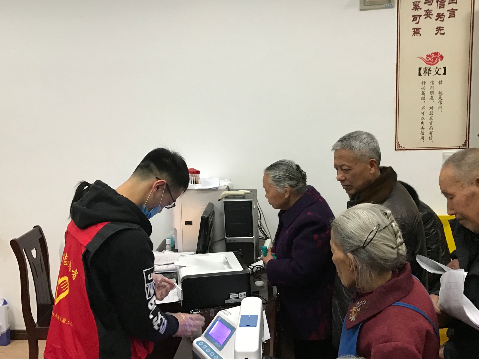 在卫生院负责人的统一安排下,志愿者们进行了分工,他们分别从事协助医生测量身高体重、抽血分类、记录病历引领服务等工作;帮忙搀扶行动不便的老人就诊;向老人详细介绍体检的好处,安慰有心理压力的老人;协助医生和护士较好的完成了工作,成为了医生的好助手。