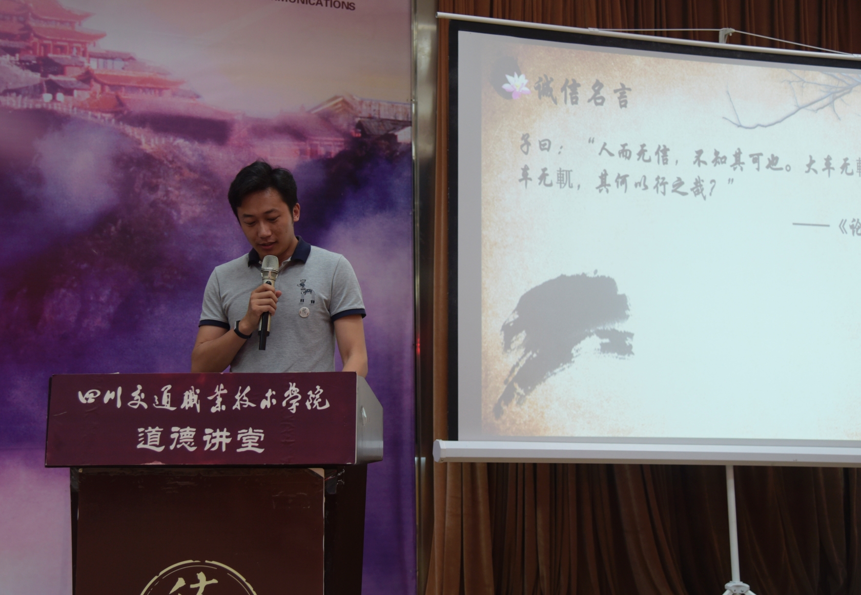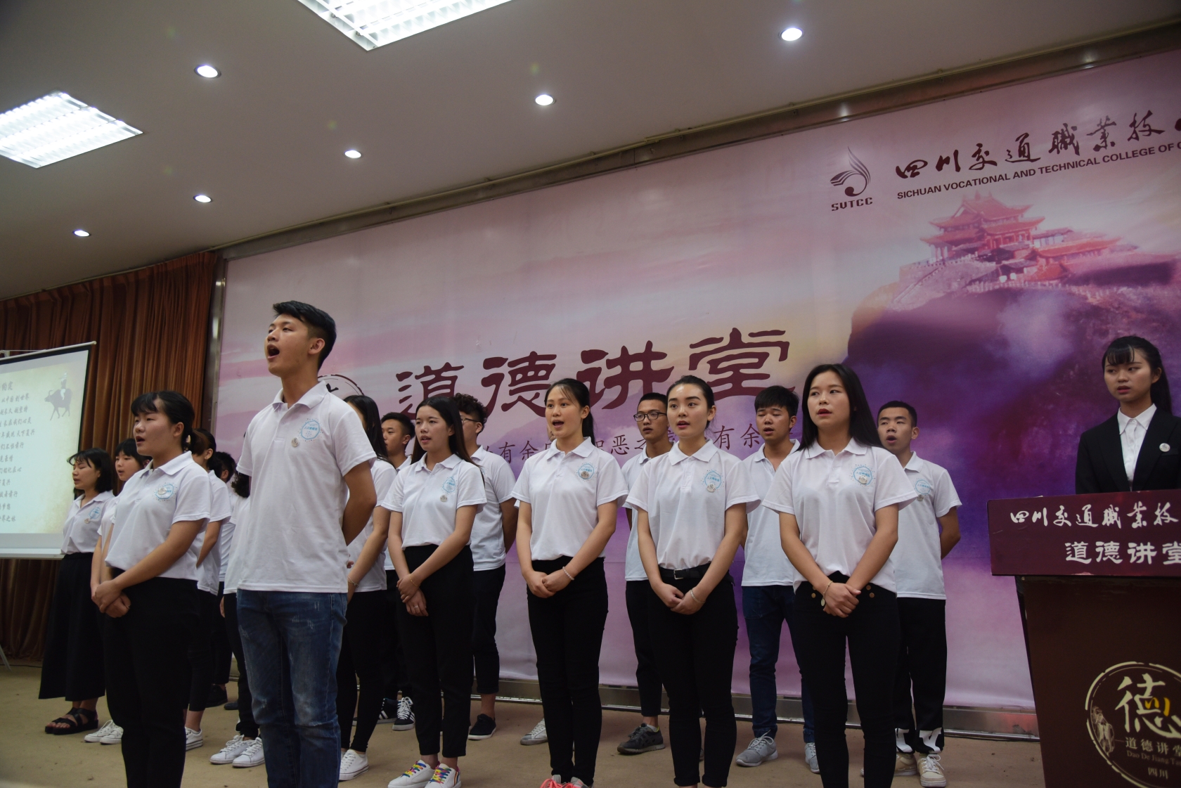 道德讲堂由唱歌曲、诵经典、学模范、谈感想、送祝福五个环节组成。在优美的伴奏中,一首师生大合唱《公民道德歌》拉开了讲堂的序幕。接下来,师生一同诵读了关于“诚信、友善、文明、和谐”的经典语句,观看了发生在同学们身边的优秀模范视频。通过视频学习,在场的师生感触颇深,纷纷上台分享自己对诚信、友善、文明、和谐的感想和体悟。活动最后,伴着《世纪的约定》的音乐,人文艺术系向到场嘉宾送上吉祥书签。