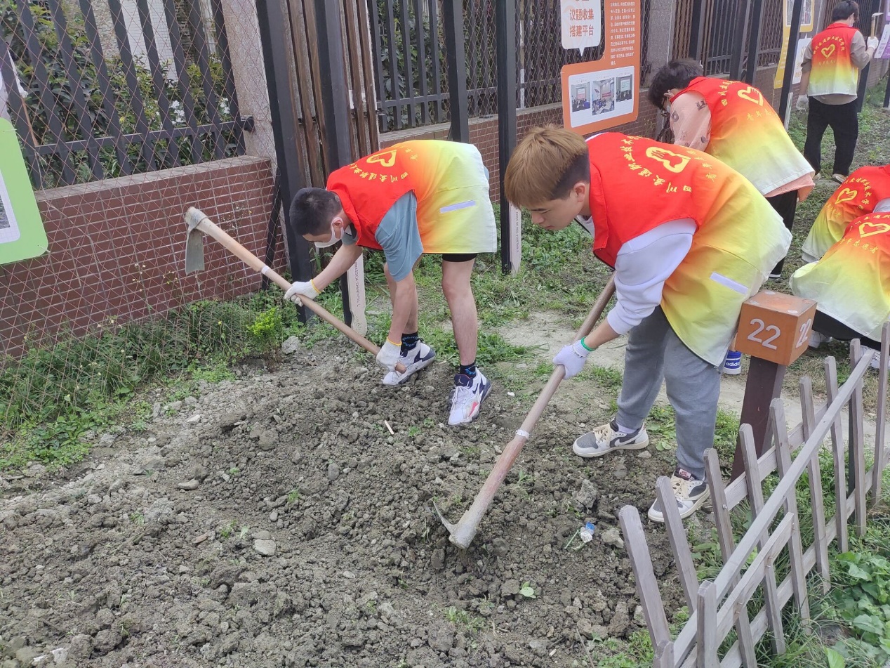 志愿者们准时到达社区,本次活动的负责人清点人数后,进行分配任务,同时强调了安全问题。每名志愿者接收到自己的任务,前往了各自对应地播种区域。他们明确要求后,对社区的土地进行除草、翻土、施肥、挖坑、播种,他们分工协作、有条不紊,放眼望去,一片繁忙的景象,整个田园弥漫着其乐融融的氛围。