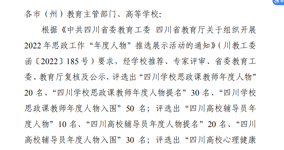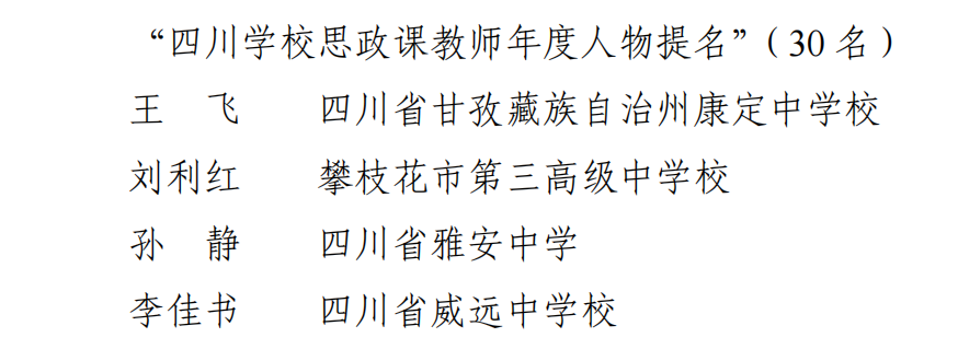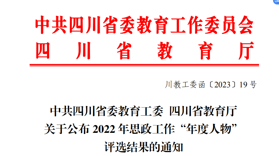 近日,中共四川省委教育工委 四川省教育厅公布的2022年思政工作“年度人物”评选结果的通知中,马克思主义学院党总支书记徐文教授斩获“四川学校思政课教师人物提名”荣誉称号。据悉,本次共评选出“四川学校思政课教师年度人物提名”30名(高职院校5名)。