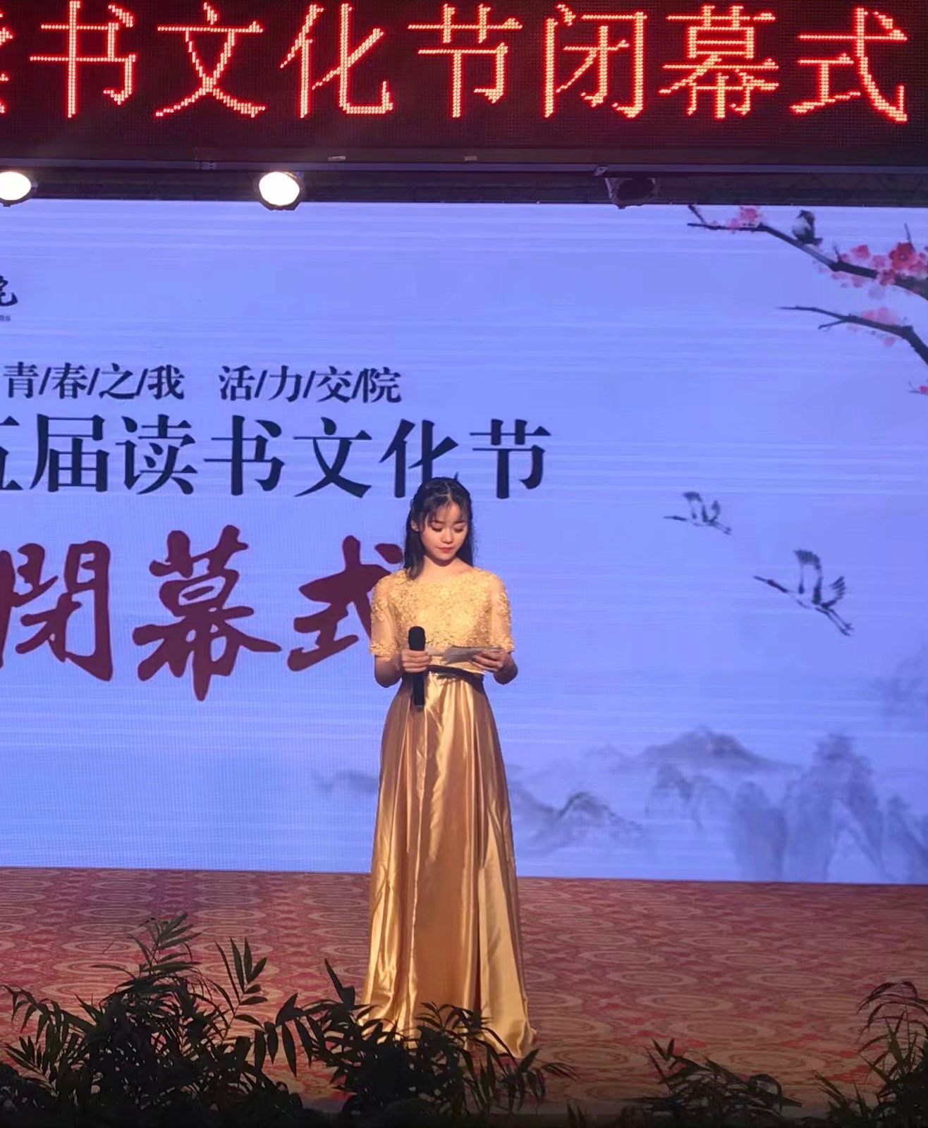 在此期间,她还面试了学院的电视台。起初对着录相机很拘谨的她,经过私下不断的练习、培训、向前辈取经,慢慢地成长为一名真正主播,并主持了学院“第五届读书文化节”闭幕式晚会。