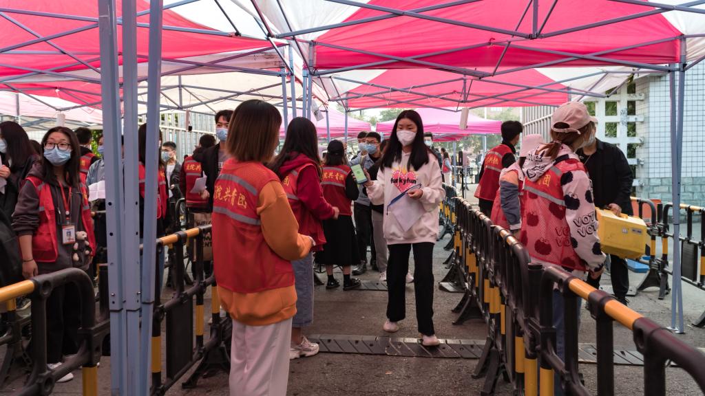 学院青年志愿者协会的刘玉莲,在考试前一天就一直在做准备工作,在正式考试将要开始时,她一直在东门旁边,帮助考生解决诸如健康码使用等繁杂的问题。志愿者田庆祥认为,志愿服务的辛苦不算什么,能够帮到考生们才是最大的价值。