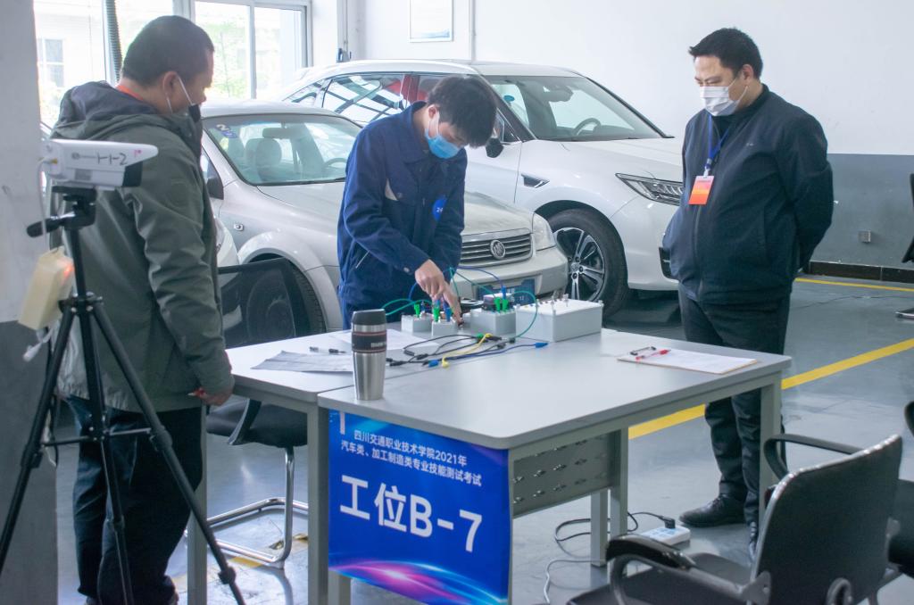 在汽修类实操考试中,考生们在车间中熟练的进行着车辆装配、汽车电路装配等专业性极强的项目。考生们沉着冷静,在繁杂的零件与构架中合理的搭建路径,根据设置的障碍解决相关的问题,既考验考生的动手操作能力,也考验考生专业的理论知识和平稳心态。