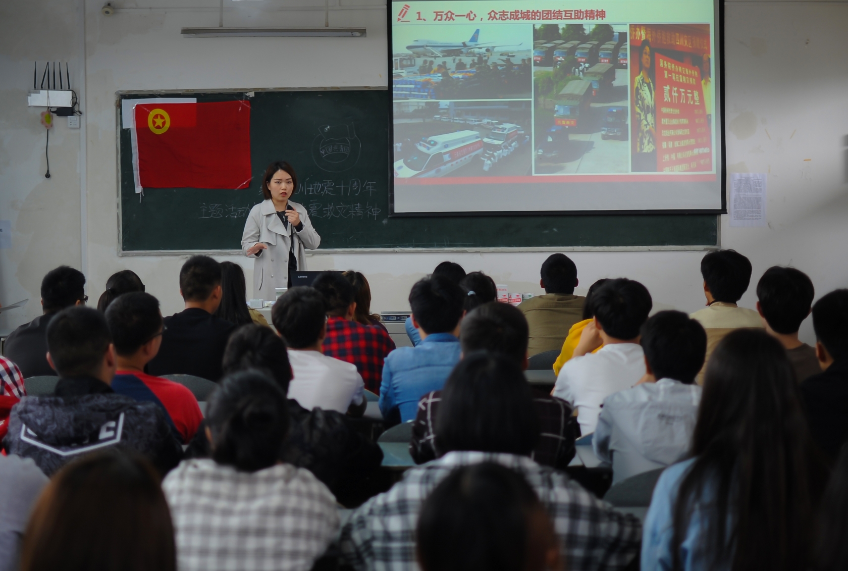5月10日,为纪念汶川地震10周年,由人文艺术系与思想政治理论课教学部联合主办、艺设16-1团支部承办的“纪念汶川地震十周年主题活动之弘扬抗震救灾精神”主题团会活动在1302教室开展。 思想政治理论课教学部刘子...
