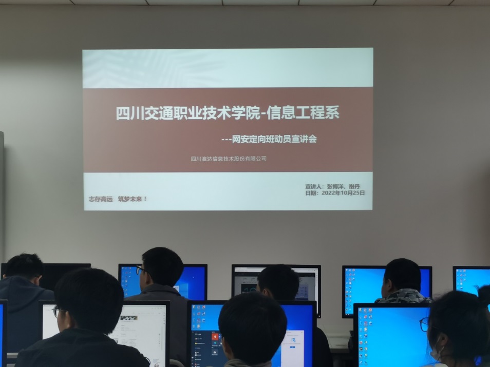 为保障2023届毕业生高质量就业,信息工程系联合四川准达信息技术股份有限公司组建信息安全专业订单班。10月31日,四川准达信息技术股份有限公司相关负责人到校,在信息楼311实训室召开订单班组建宣讲会。会上,公...