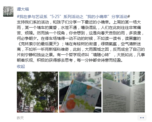 为了传播乐观向上的心理健康理念,培养自尊自信、珍视生命,理性平和、百折不挠的健康心态,我系组织开展了“我的小确幸”网络征集分享活动。5月6日至11日期间,全系师生通过文字配以图片、音频或视频的形式,以...