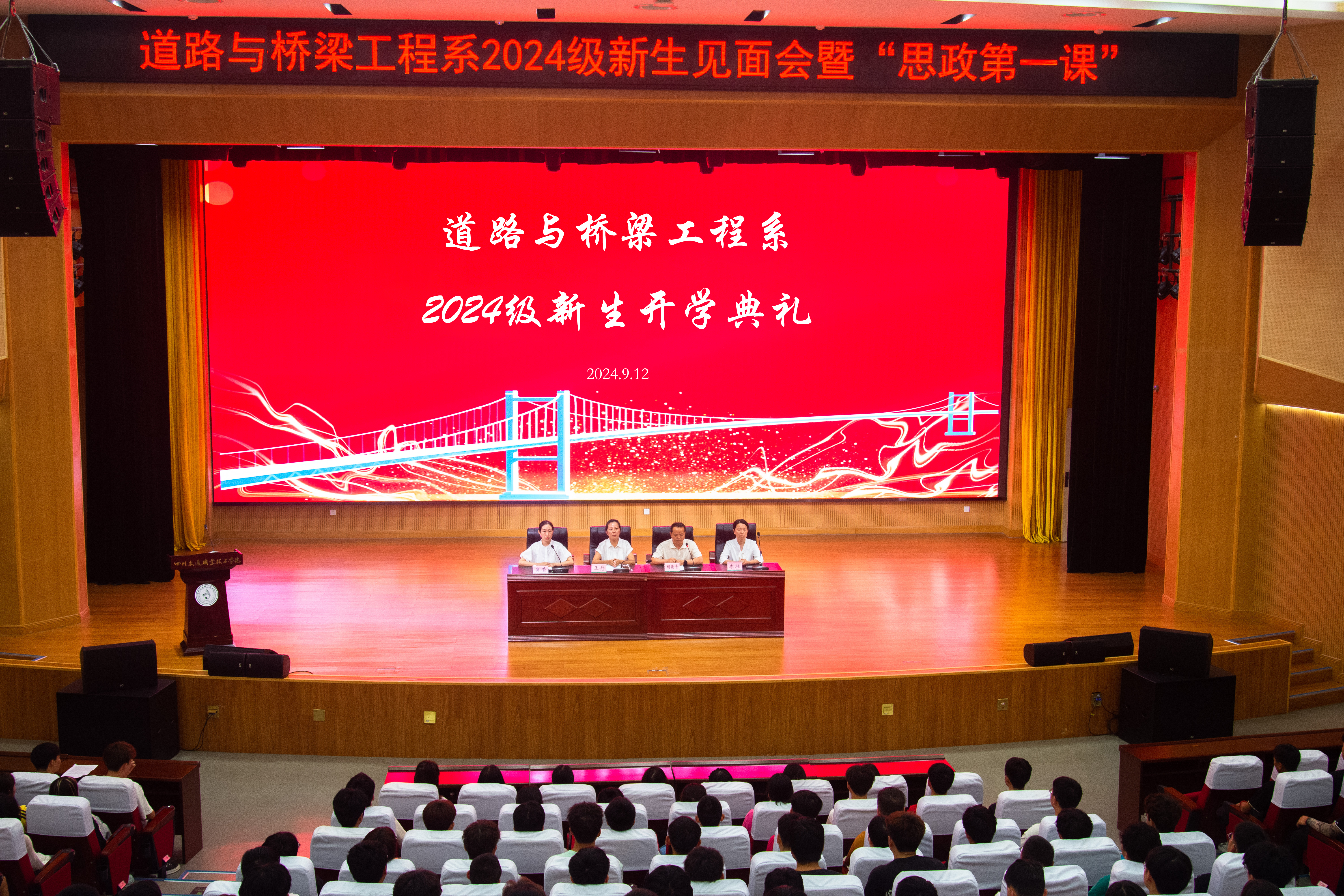 9月12日下午道路与桥梁工程系在学院学术报告厅举行2024级新生开学典礼暨"思政第一课",道桥系领导班子、教师代表、全体辅导员和全体新生300余人参加了本次活动。典礼在庄严的国歌声中正式拉开帷幕,道桥系副主...