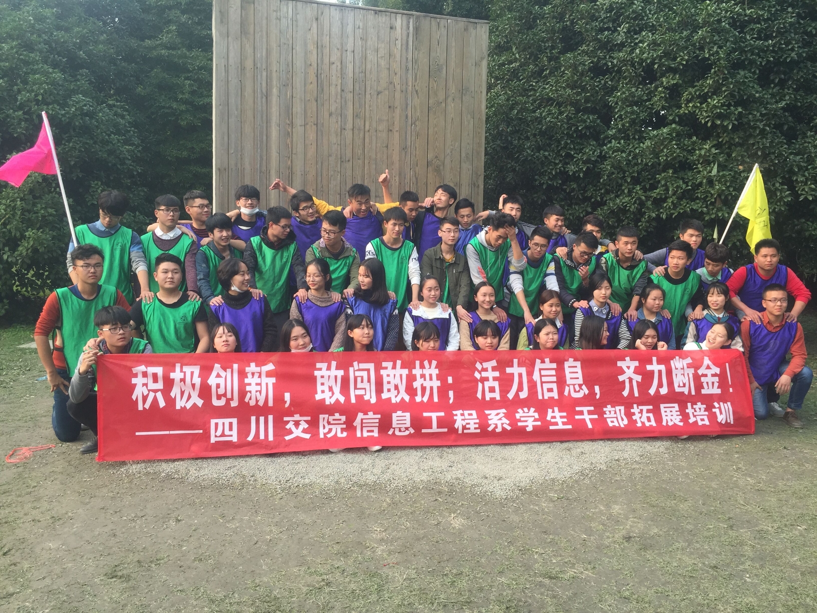 信息工程系于11月12日至11月13日,在校外开展了素质拓展活动。 教练将人员分成了两个小队,分别是DDW队和万众一心队,两个队都展示了自己的队旗、队名、队歌,并解释了其含义。活动第一天,各个干部相互认识、相...
