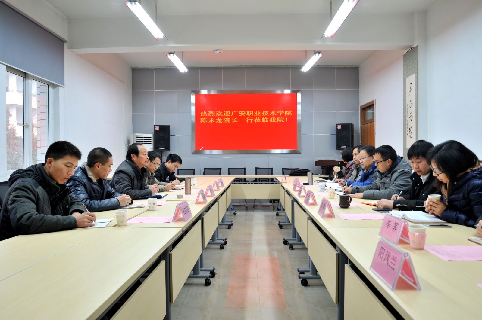 1月7日,广安职业技术学陈永龙院长一行,来我院考察交流。学院副院长陈斌,教务处、建筑工程系、人文艺术系领导班子参加了交流座谈。 图为交流会现场 会上,陈斌向来宾详细介绍了我院的基本概况,同时进行了示范...