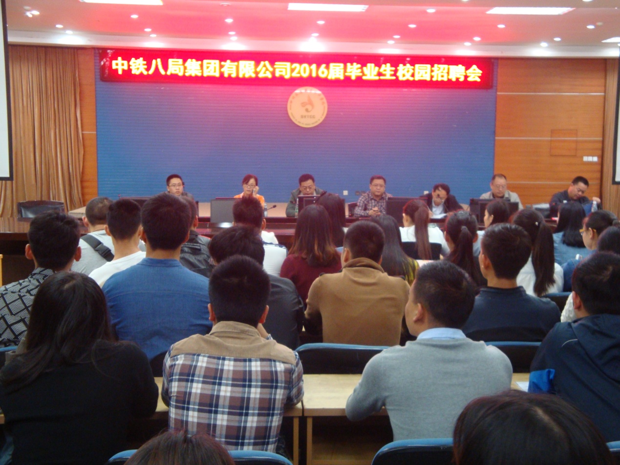 10月22日,中铁八局集团旗下5家二级公司来我院选聘2016届毕业生,来自道路与桥梁工程系、建筑工程系近400名同学参加了宣讲会。 图为宣讲会现场 中铁八局集团招聘组成员就用工方式、薪资待遇作了详细介绍,通过简...