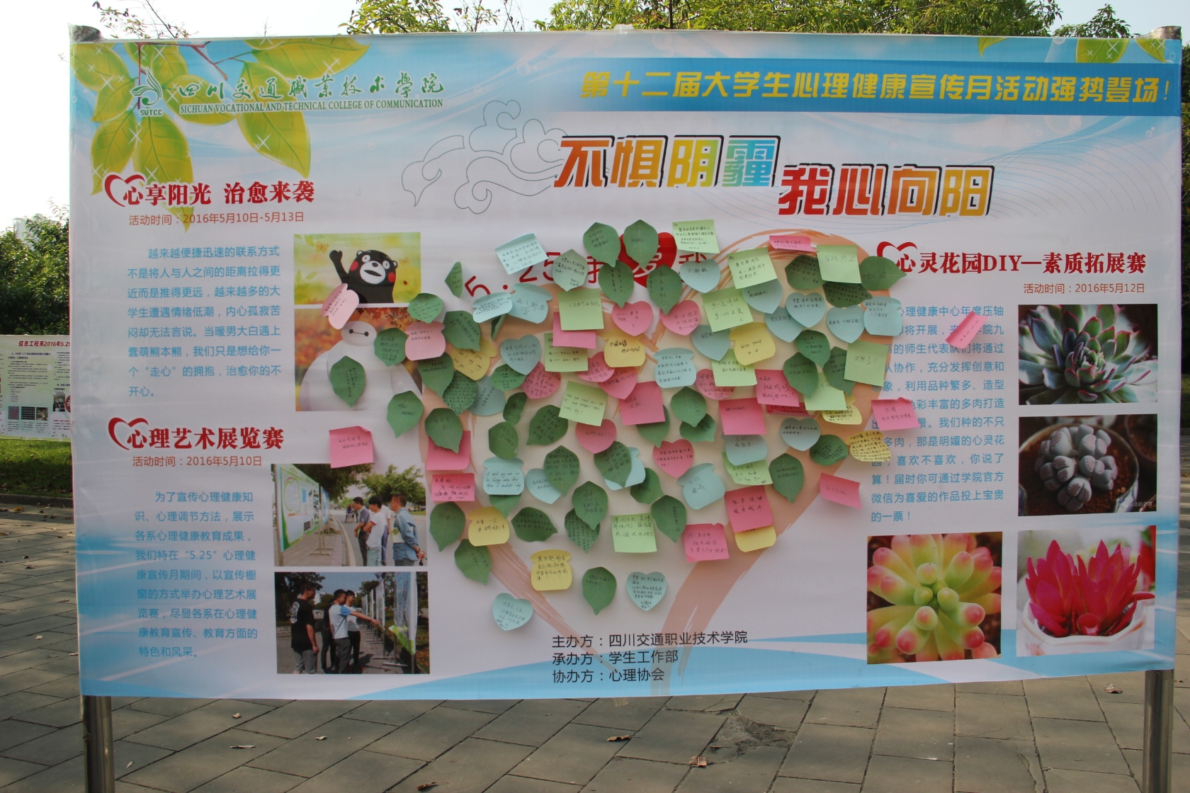 5月10日,我院“5.25”大学生心理健康宣传月重要活动之一心理艺术展览赛在风华广场举行,学生工作部心理健康教育中心和各系精心制作的10个展板在广场展出。展板图文并茂,内容丰富,或展示各系心理健康活动风采,...