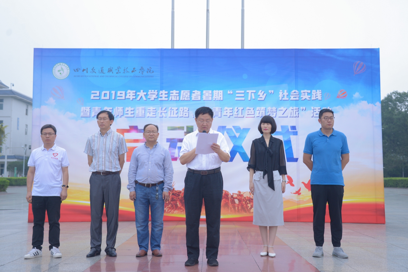 7月9日上午,四川交职院在紫毫广场举行2019年大学生志愿者暑期“三下乡”社会实践暨青年师生重走长征路、“青年红色筑梦之旅”活动启动仪式,学院党委书记王东平为“青年师生重走长征路”团队授旗,副院长杨甲奇...