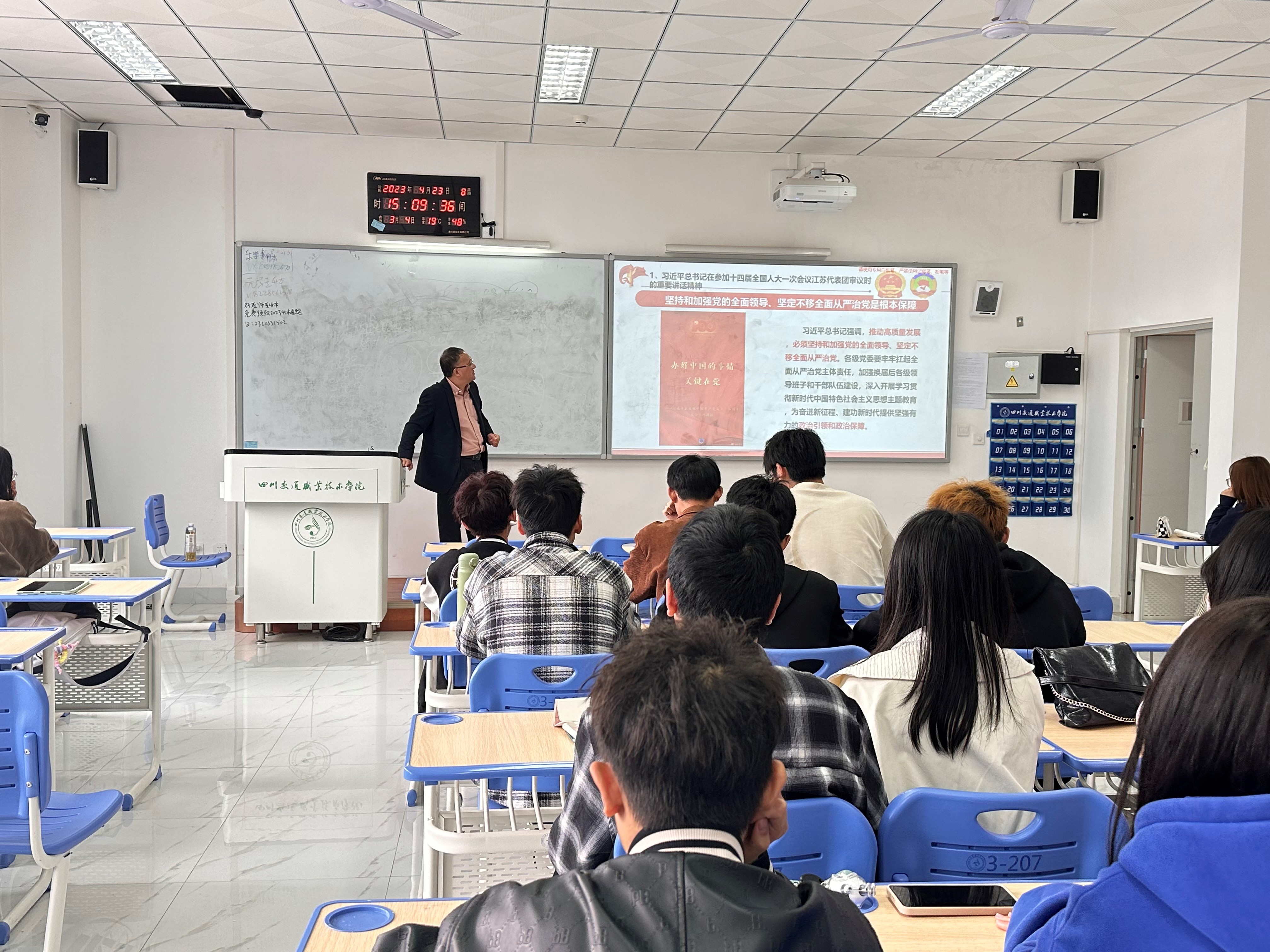 近日,交职院党委副书记、院长蒋永林走上讲台为同学们讲授主题为“蓝图已经绘就,奋斗正当其时——2023年全国两会的《形势与政策》课。蒋永林分别围绕习近平总书记同出席2023年全国人大代表、政协委员共商国是重...