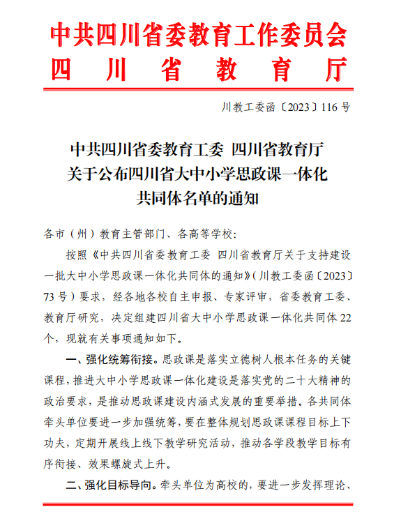 近日,中共四川省委教育工委、四川省教育厅发布《中共四川省委教育工委四川省教育厅关于公布四川省大中小学思政课一体化共同体名单的通知》(川教工委函【2023】116号)《中共四川省委教育工委 四川省教育厅关于...